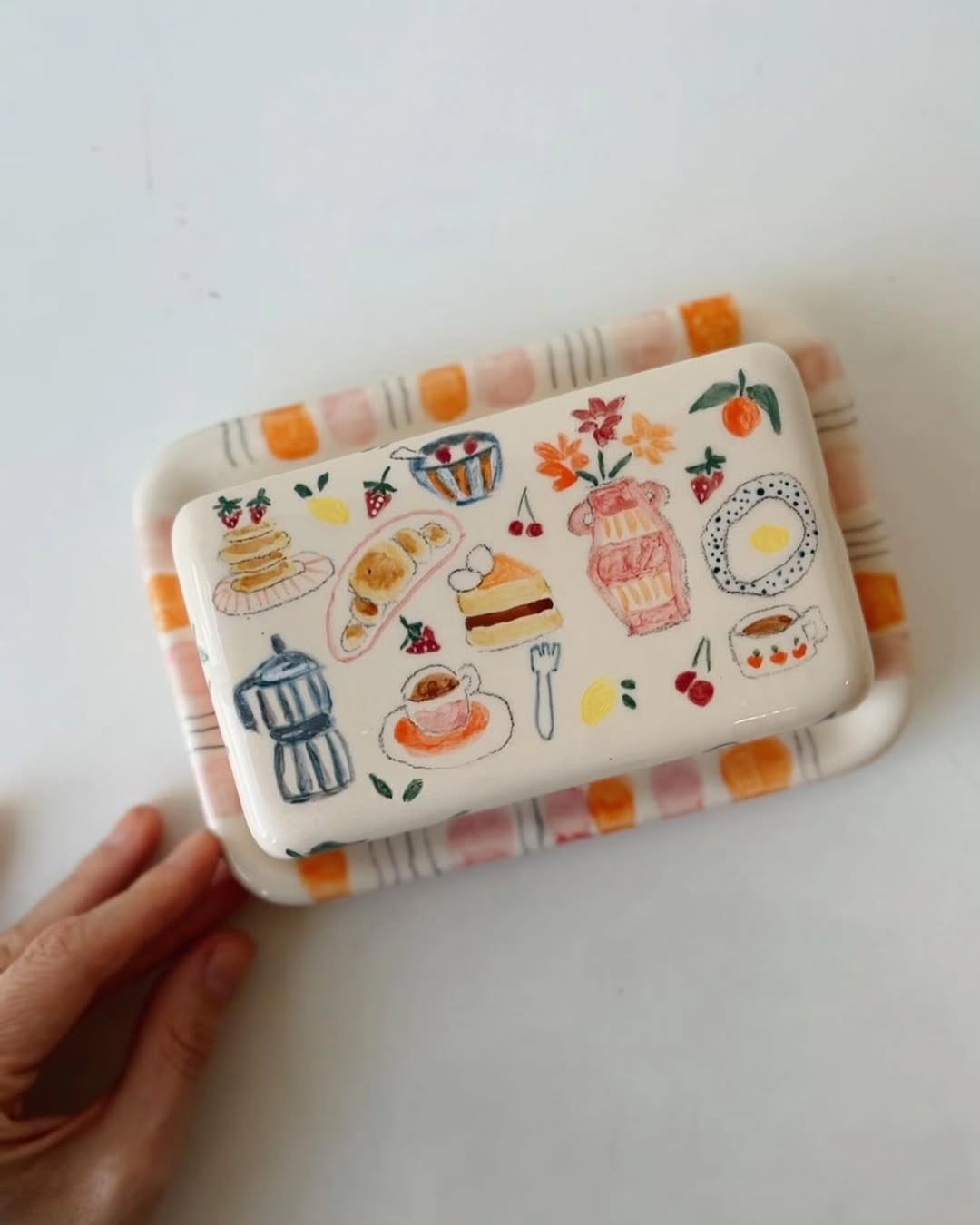 Tiny teacups, pastries, and moka pots turn this butter dish into a painted love letter to lazy breakfasts. The hand-drawn quality and soft watercolor hues feel charmingly homemade, while the grid-patterned tray adds a modern graphic twist. It’s not just for storing butter—it’s setting the mood for your next slow morning.