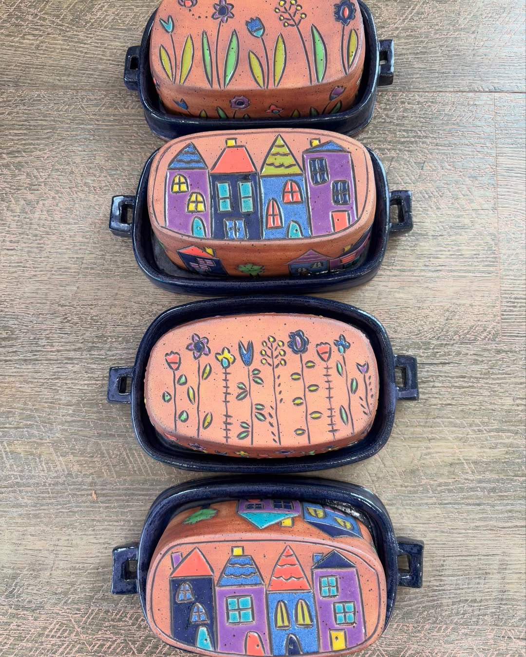 Bold black lines and bright, blocky colors bring these terracotta butter dishes to life like storybook illustrations. From wildflowers to whimsical rooftops, each one feels like a tiny slice of folk-art fantasy. The matte texture and hand-carved forms add even more character—like something you’d find at a village market (and never put away again).