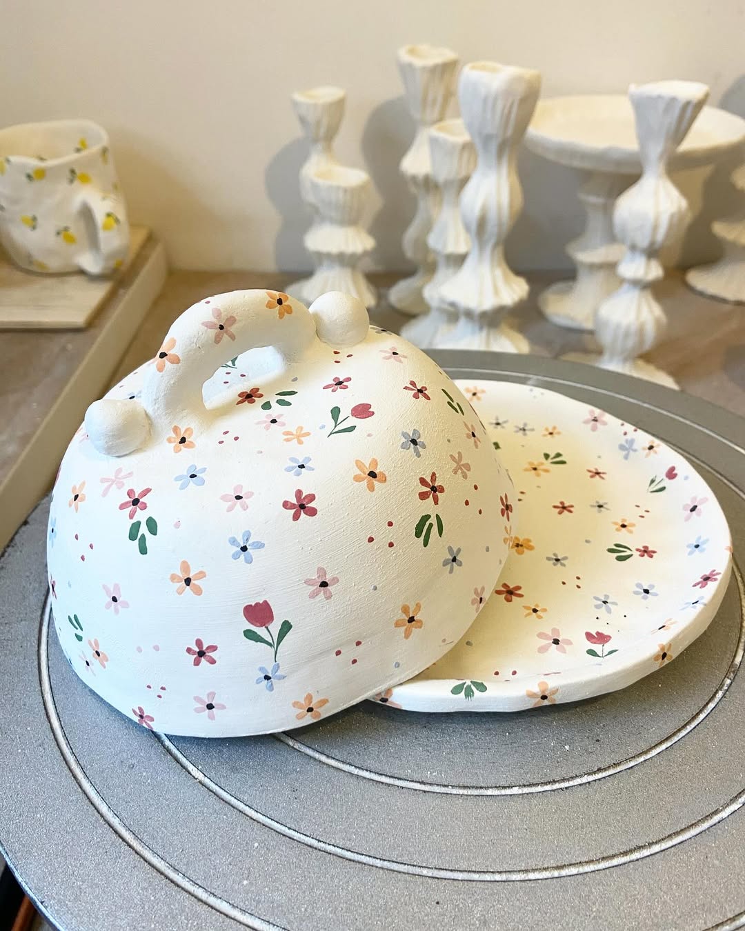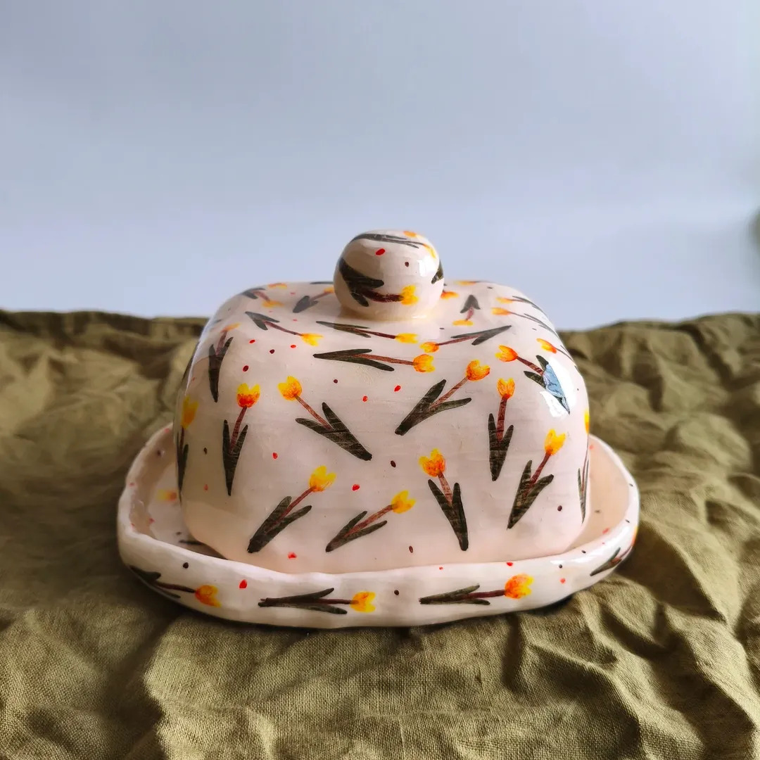 Soft matte white clay is dotted with tiny hand-painted blooms that look like they wandered in from a meadow. The sculpted handle and organic shape add to its charm, giving it that perfect imperfect, small-batch feel. Butter’s never looked so gentle.