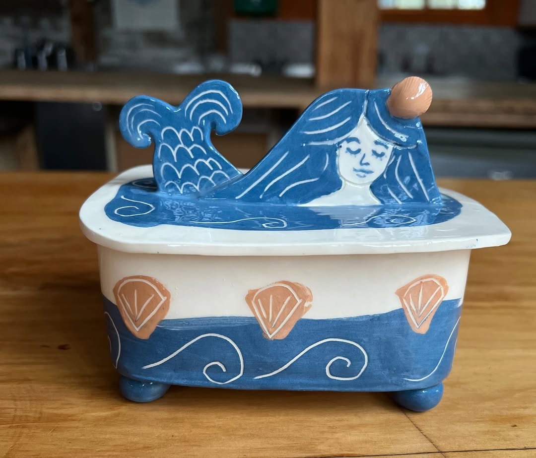 This butter dish dives straight into storybook charm. A sleepy-eyed mermaid lid and scallop shell motifs make it feel more like coastal pottery than countertop storage. The hand-painted waves in blue and coral add a whimsical, nautical flair that’s part Greek isle, part children’s fable. It’s butter storage, but make it sea-nic.