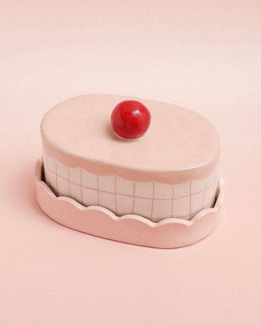 Soft pink glaze, scalloped edges, and a cherry-red knob—this butter dish leans fully into its dessert disguise. The grid pattern gives it a playful, cake-box vibe, while the monochrome palette keeps things chic, not sugary. It’s part kitchenware, part art piece, and totally ready for its countertop close-up.