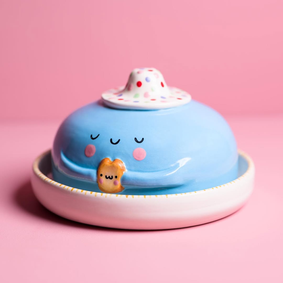 Every breakfast table needs a little serotonin, and this butter dish delivers. The soft blue dome features sleepy eyes, rosy cheeks, and a toast-hugging smile—basically, joy in ceramic form. A polka-dot hat for a handle adds just the right amount of party energy. Kids will love it. Adults will secretly love it more.