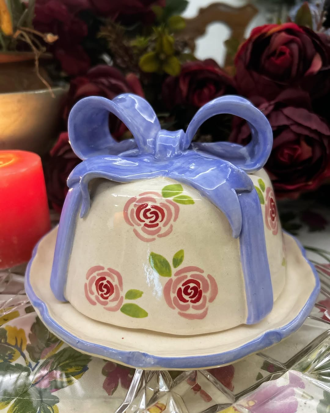 Curvy, hand-painted roses and a sculpted lavender bow turn this butter dish into a year-round Valentine. The glossy glaze gives it a polished, vintage-laced charm, while the soft pastel palette keeps it feeling sweet, not saccharine. Looks like a present. Works like a kitchen staple.