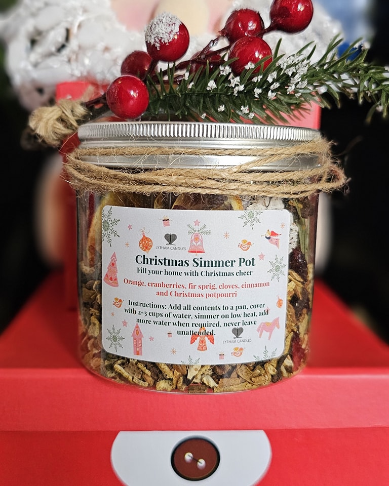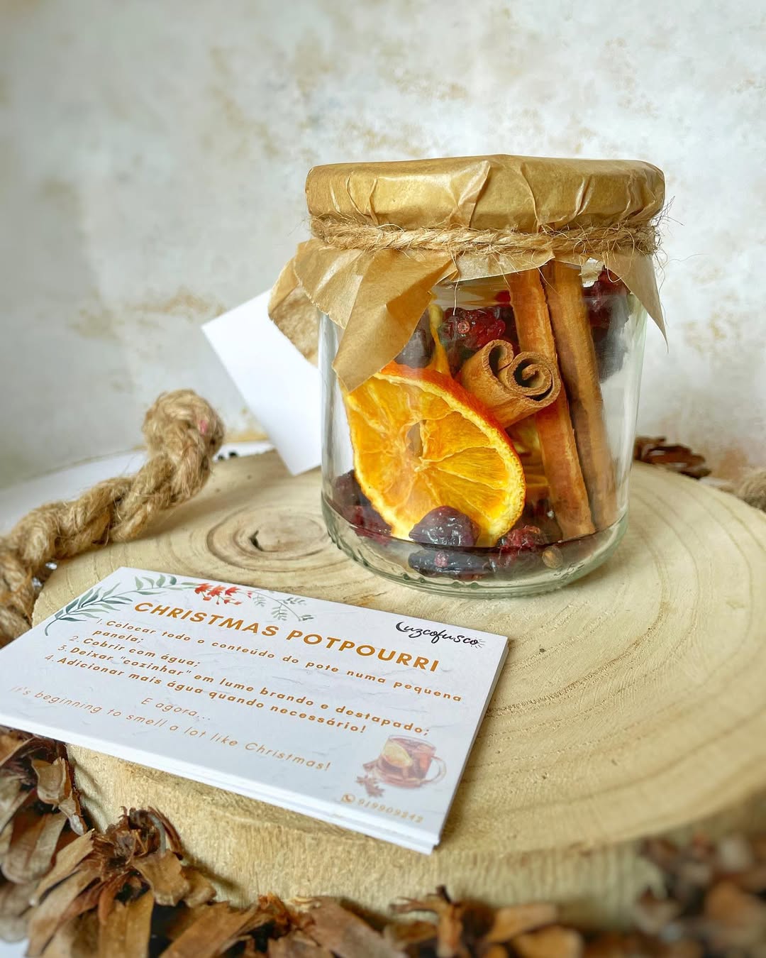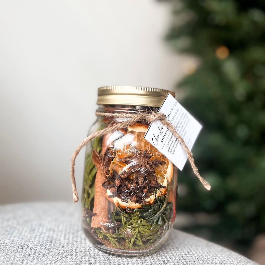 A: A Christmas potpourri jar is a decorative glass jar filled with dried fruits, spices, herbs, and natural elements that give off a warm, festive scent. Common ingredients include dried oranges, cinnamon sticks, cloves, star anise, cranberries, and pine sprigs. These jars are used both as holiday décor and as a natural way to make a home smell cozy and seasonal.