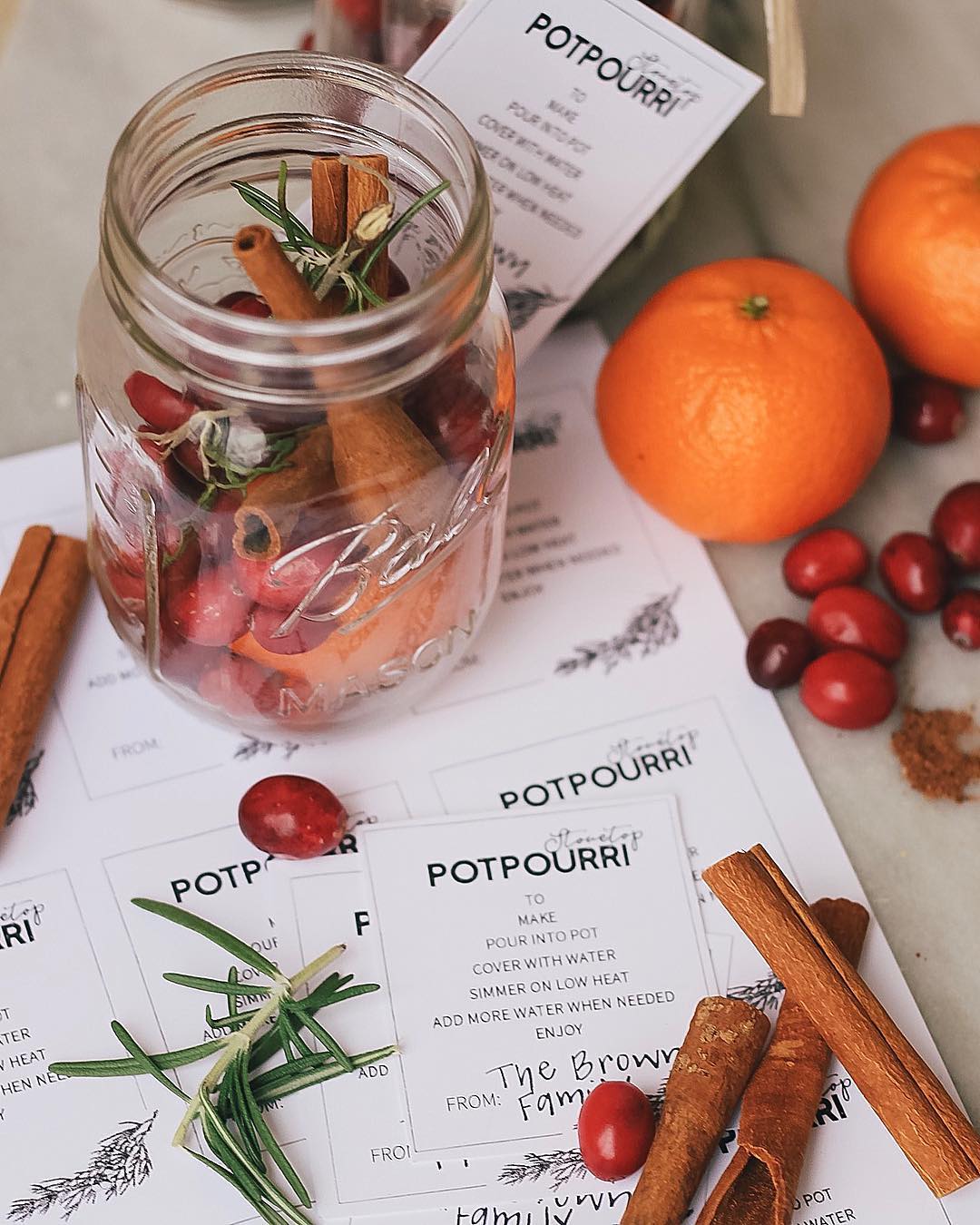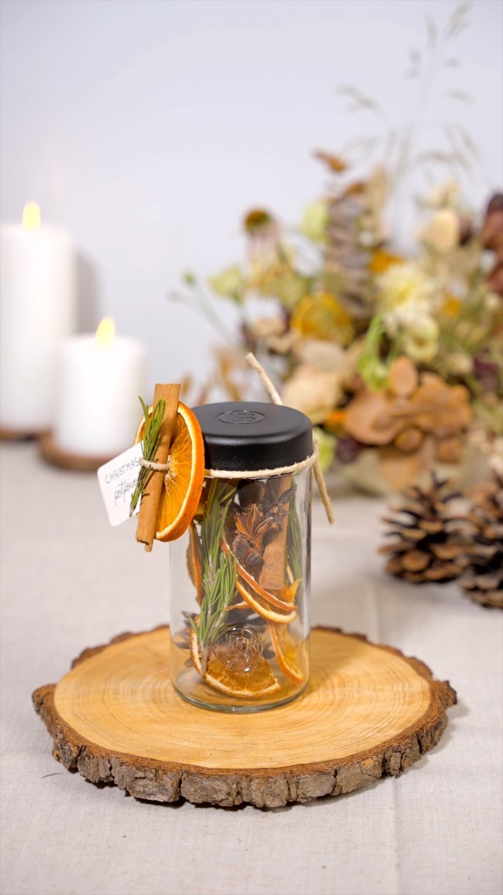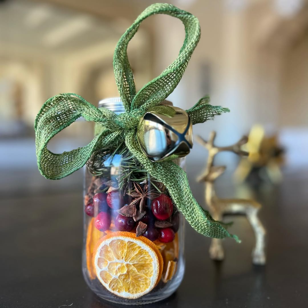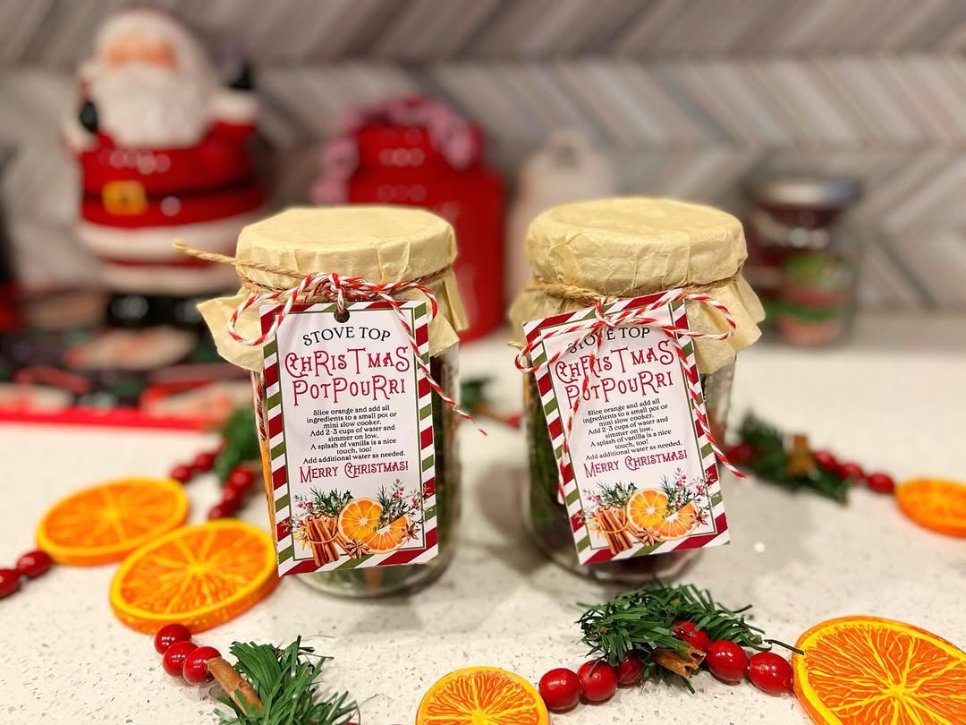 Dried citrus, spices, and potpourri mix peek through a clear jar labeled with whimsical holiday doodles. A festive fir-and-berry topper turns the lid into a mini wreath moment, while rustic twine seals the cozy vibe. Instructions are right on the jar, making it grab-and-go gift perfection. Smells like Christmas, looks like it came from Santa’s workshop.