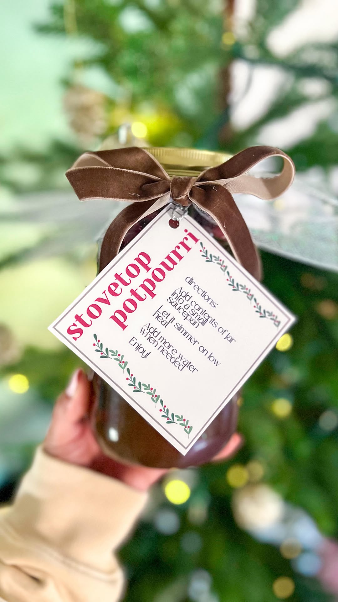 A luxe brown velvet ribbon instantly elevates this simple stovetop potpourri jar to hostess-gift status. The oversized tag gives clear simmer instructions, framed in a sweet holly border that feels straight off a Christmas card. The jar’s contents stay hidden, letting the packaging charm take center stage. One part practical, one part Pinterest-worthy.