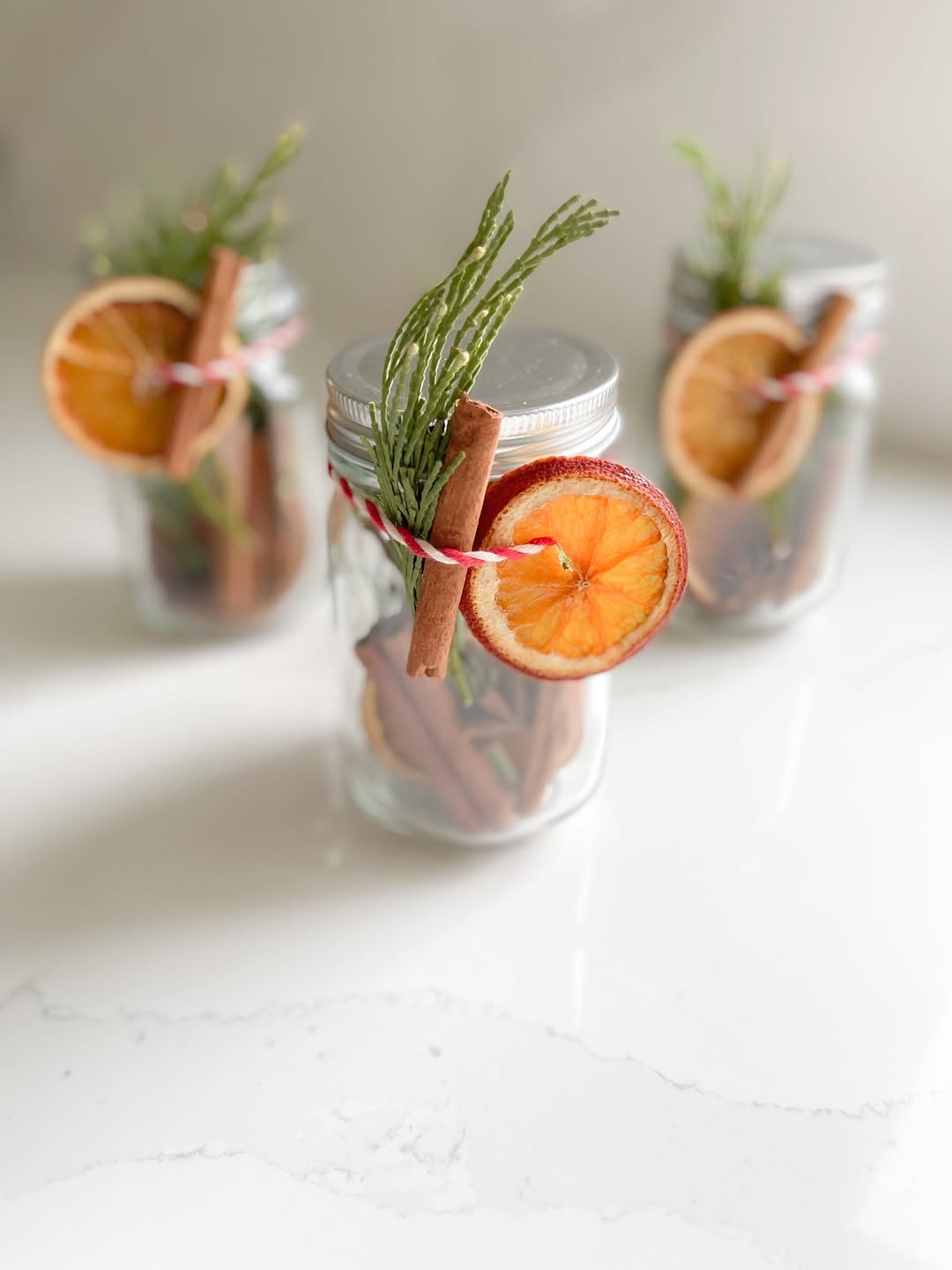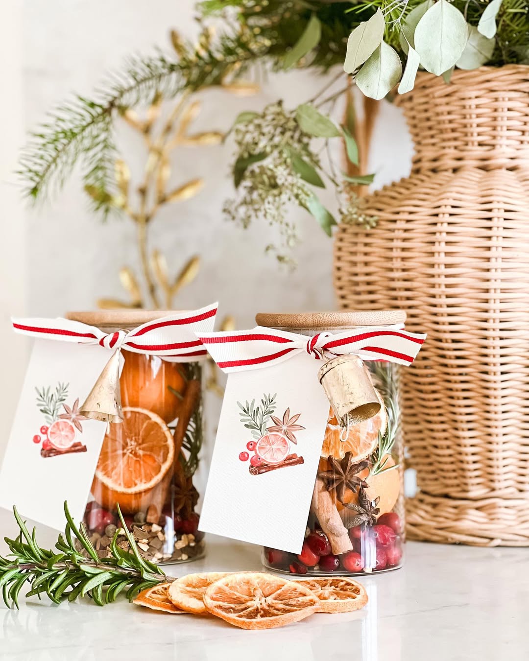 Clear jars keep it simple, letting orange slices and cinnamon sticks shine inside and out. A sprig of cedar and candy-cane twine wrap just enough festivity around the lid—no extra frills needed. Understated, modern, and effortlessly giftable. Like a Scandinavian Christmas in a jar.