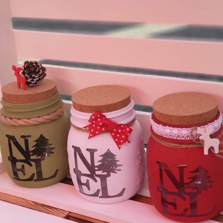 Chalky finishes in olive, blush, and red turn basic jars into holiday shelf stars. Each one gets its own flair—twine, lace, mini deer charms, and a bow that screams “handmade, not store-bought.” The cutout tree and bold “NOEL” lettering balance rustic charm with graphic punch. Bonus: they’re cute enough for décor but functional enough to stash cocoa or potpourri.