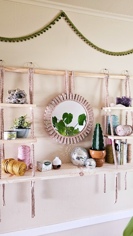 Macrame straps and wooden planks give this wall hanging a perfect balance of structure and softness. The woven loops act as both support and statement, turning storage into display-worthy art. A round mirror anchors the center, adding function without breaking the chill, boho vibe. Ideal for small spaces that need both style and smart storage.