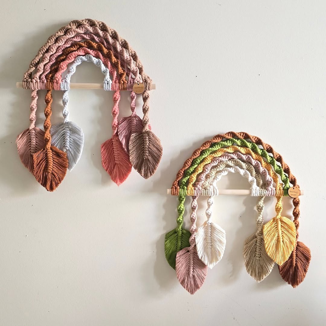 Twisted cords, leafy tassels, and sun-washed tones turn this macrame wall décor into a cozy color story. The mix of earthy and pastel shades gives it nursery charm without leaning too precious. Hanging from a simple wooden dowel, it’s lightweight, textured, and totally giftable. One of those pieces that quietly makes a room feel warmer.