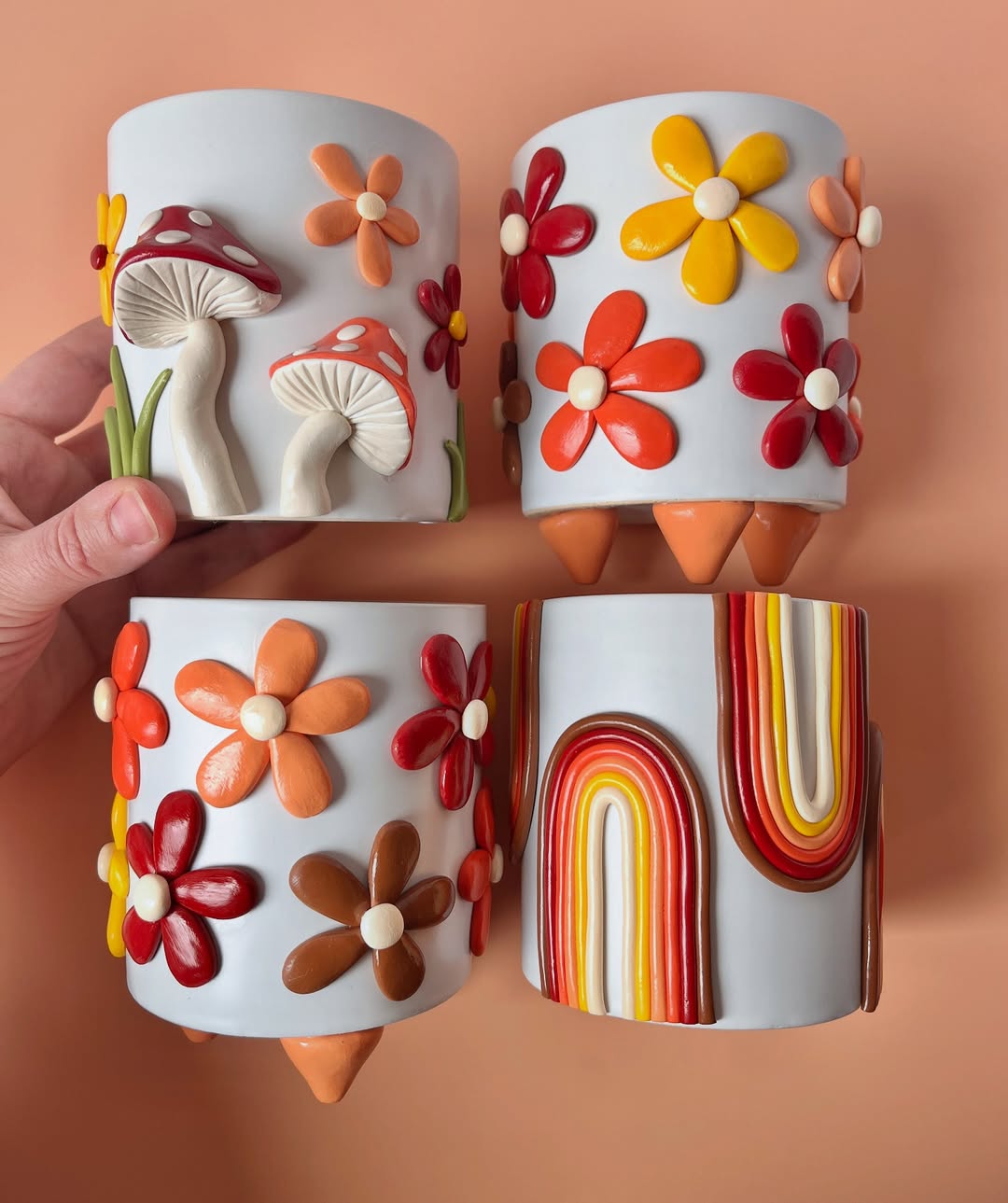 Mushrooms, daisies, and retro rainbows—these ceramic planters don’t just hold plants, they hold vibes. Raised clay details give them a playful, tactile feel, while the warm-toned palette channels peak 70s nostalgia. Cone-shaped feet add extra character (and a little lift). Sell them solo or as a mix-and-match set—either way, they’re shelfie-ready.