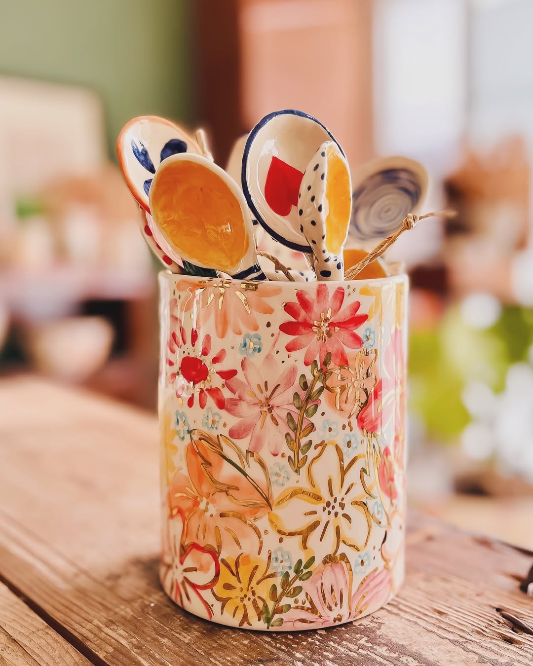 Every inch of this handmade ceramic set—from the floral brushstrokes to the dotted, dipped spoons—feels like functional art. Glossy glazes pop against the watercolor-style blooms, while gold detailing adds just the right touch of luxe. Perfect as a utensil holder, vase, or countertop showpiece. One of those rare kitchen items that looks just as good not being used.