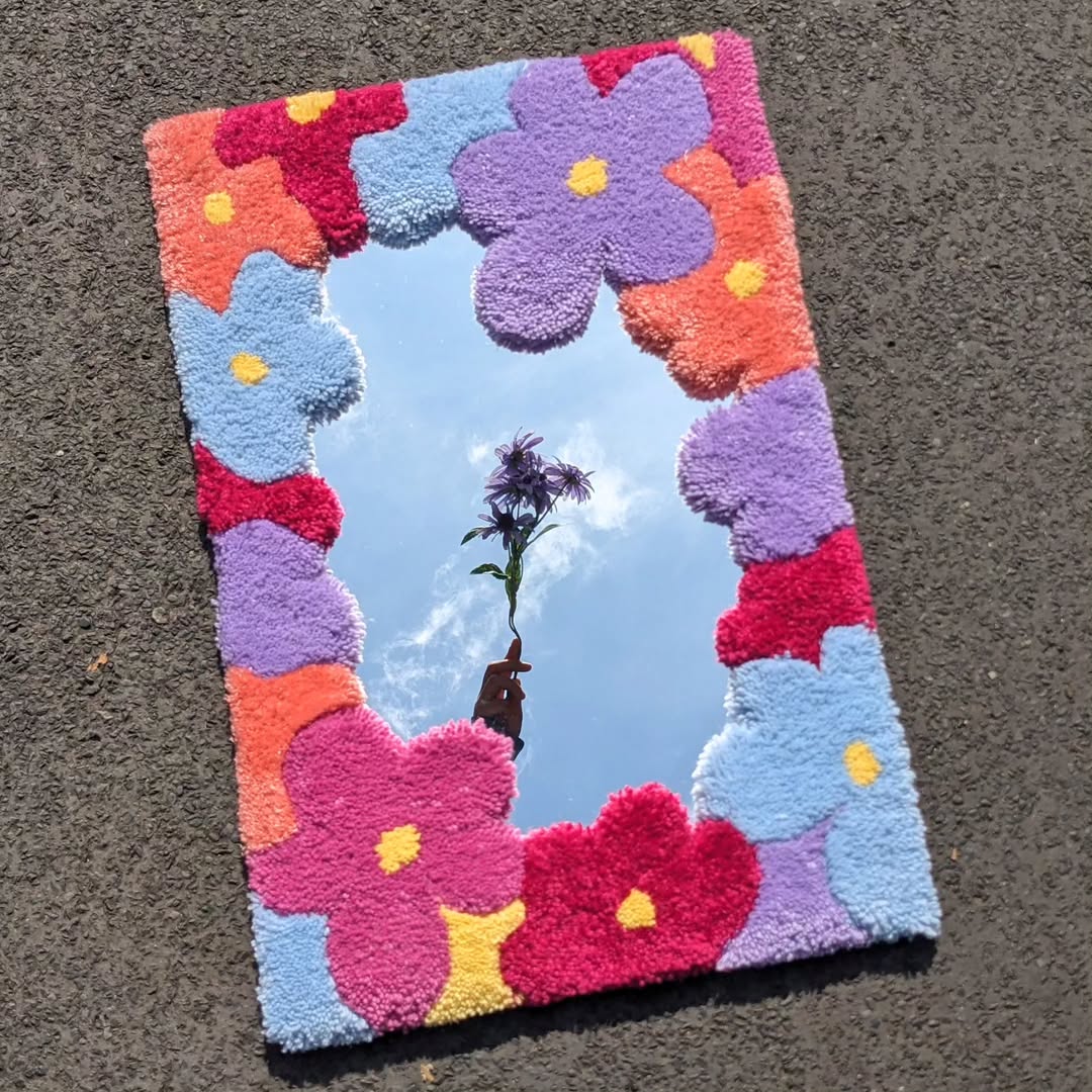 Bright, oversized florals give this handmade mirror the full Y2K-meets-cottagecore treatment. The tufted border adds a plush, tactile edge that feels more like art than utility. Between the punchy palette and soft texture, it turns any wall or floor vignette into a photo-ready moment. Perfect for dorms, dressing corners, or your next craft fair bestseller.