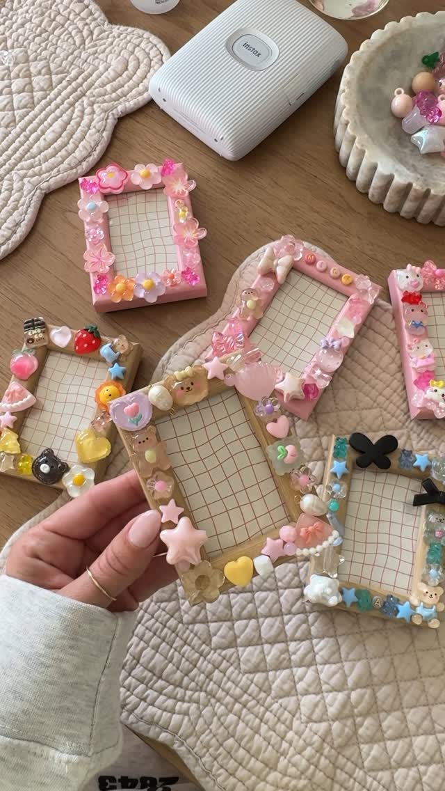 These DIY photo frames lean all the way into cute overload—and that’s exactly the charm. Think glossy charms, candy-pink beads, and miniatures that look straight out of a capsule toy machine. Mixing textures (resin, pearls, glitter) makes each one feel playful but personal. Bonus: they’re totally giftable and TikTok gold if you’re selling at craft fairs or online shops.