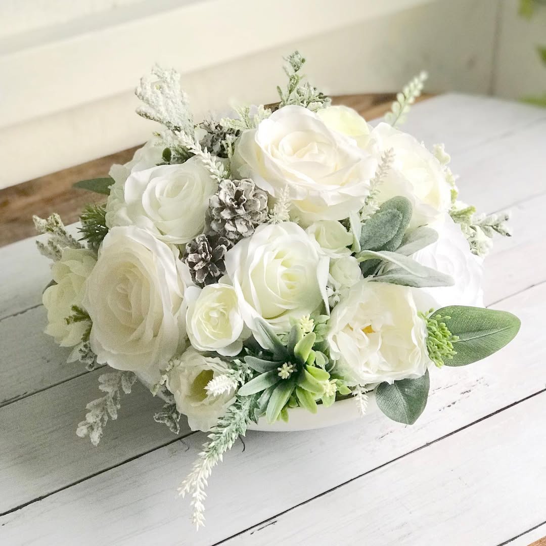Soft-touch petals, flocked greenery, and frosted pinecones make this faux arrangement feel surprisingly lifelike. The neutral white palette leans timeless, while subtle texture layering adds depth and elegance. Styled in a low ceramic bowl, it works for weddings, centerpieces, or everyday calm. Zero water needed—just compliments guaranteed.