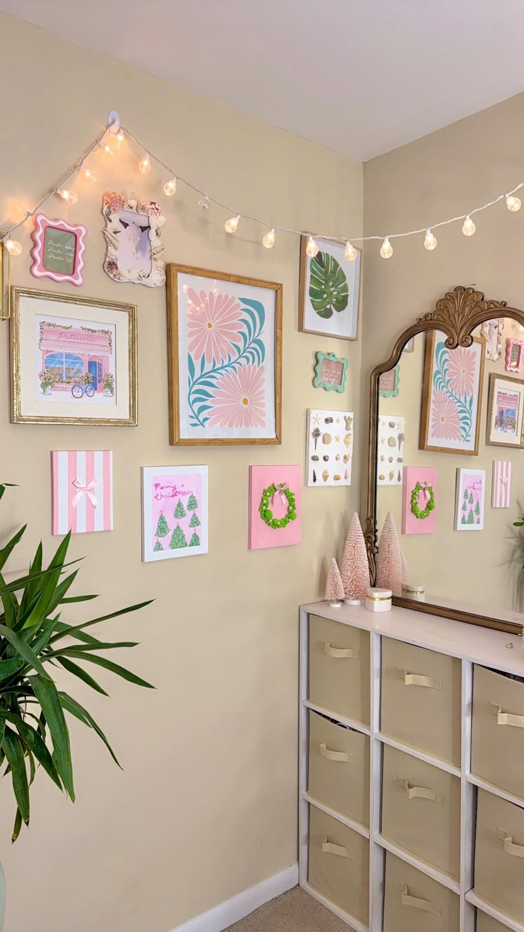 Pink-striped bows, glitter wreaths, and retro café prints turn this gallery wall into a full-on mood board. Each piece pops against the neutral wall thanks to bubblegum hues and playful contrast. Framing styles vary—some ornate, some clean-lined—which keeps the look collected, not cluttered. String lights above add just the right glow for a cozy, creative corner worth showing off (or selling as a set).
