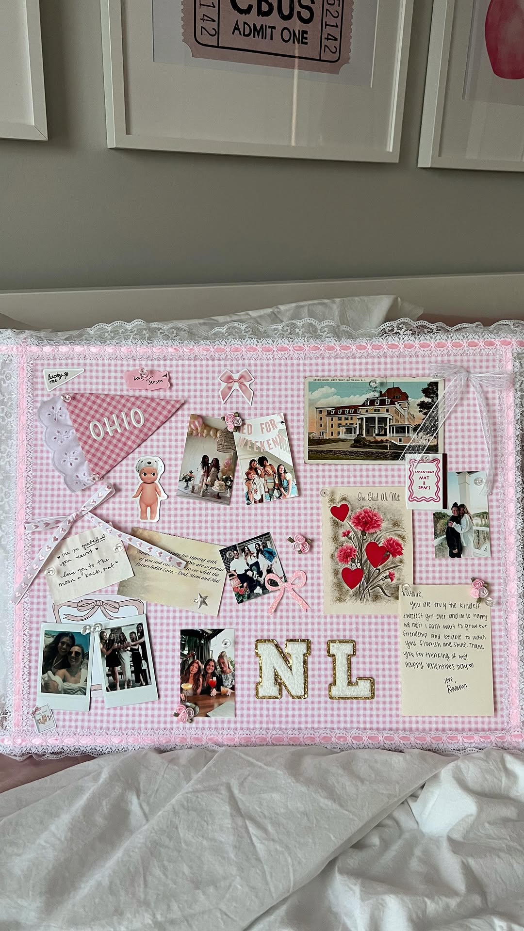 Layered with mementos, handwritten notes, and a sprinkle of vintage flair, this gingham pinboard turns nostalgia into décor. The lace trim softens the edges while pastel pink accents tie everything into a sweet, cohesive look. Every element feels intentionally placed—like a love letter to friendship. It’s functional, personal, and totally sellable for the sentimental crowd.