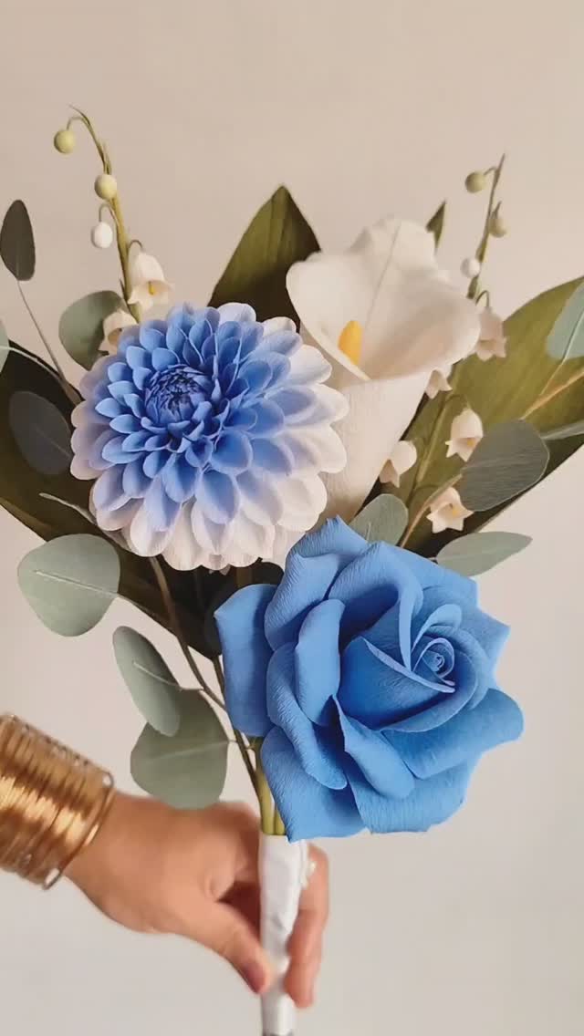 Gradient petals, delicate curls, and lush leaves—each flower looks real until you get up close. Crepe paper brings a soft, sculptural texture that mimics nature without the wilt. The palette leans into romantic cool tones, making it a perfect sell for weddings, gifts, or long-lasting home décor. It’s art disguised as florals, and that’s the real bouquet flex.