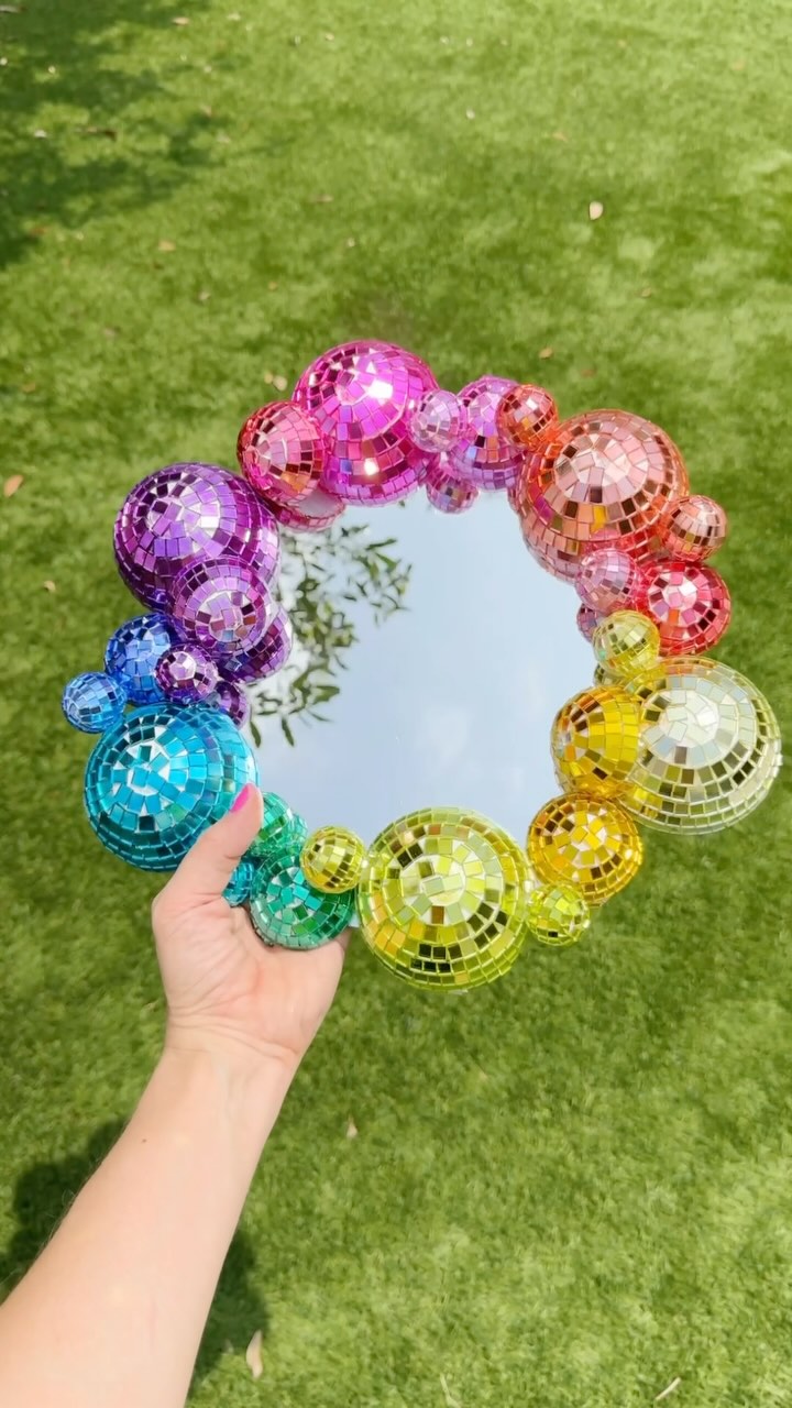 Tiny mirrored tiles and bubbly shapes turn this mirror into a full-on party circle. The ombré rainbow layout keeps it playful while still totally curated. Natural light makes it sparkle, but it’s just as show-stopping indoors—think dorm walls, vanities, or vendor booths. Basically, it’s self-reflection… but fabulous.