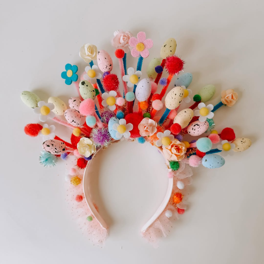 Colorful pipe cleaners shoot upward like a burst of spring fireworks. Speckled mini eggs and tiny felt flowers perch on each stem for playful texture. Bright pom-poms add extra pops of color that make the design feel festive and energetic. It’s a bold Easter headpiece that turns a simple craft into a full-on celebration.