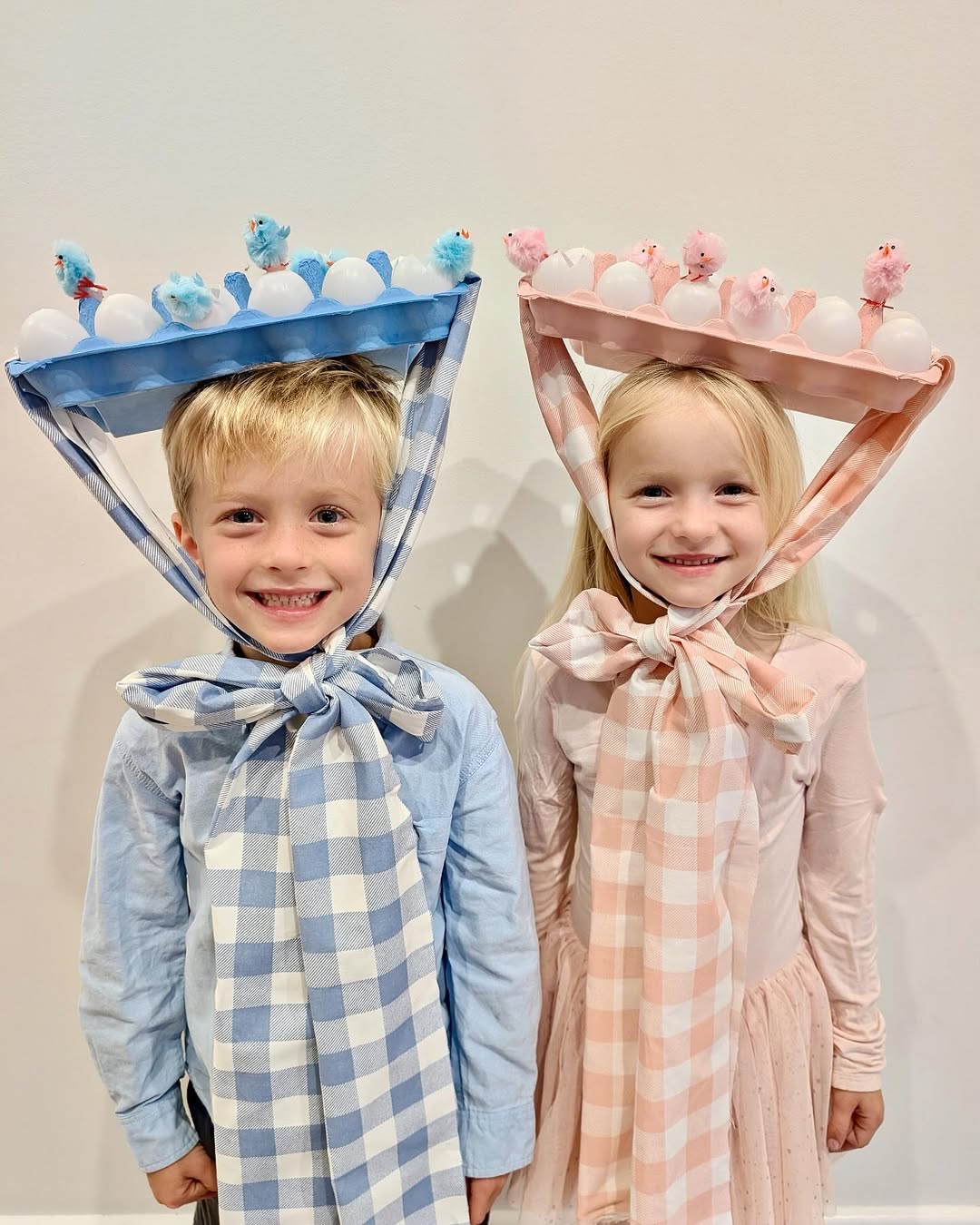 Empty egg cartons turn into the cutest Easter hat base with a little creativity. Fluffy chicks and plastic eggs lined across the top create a playful farmyard moment. Gingham scarves tied under the chin add color and keep the bonnets snug for little wearers. It’s a clever recycled craft that always steals the show at school Easter parades.