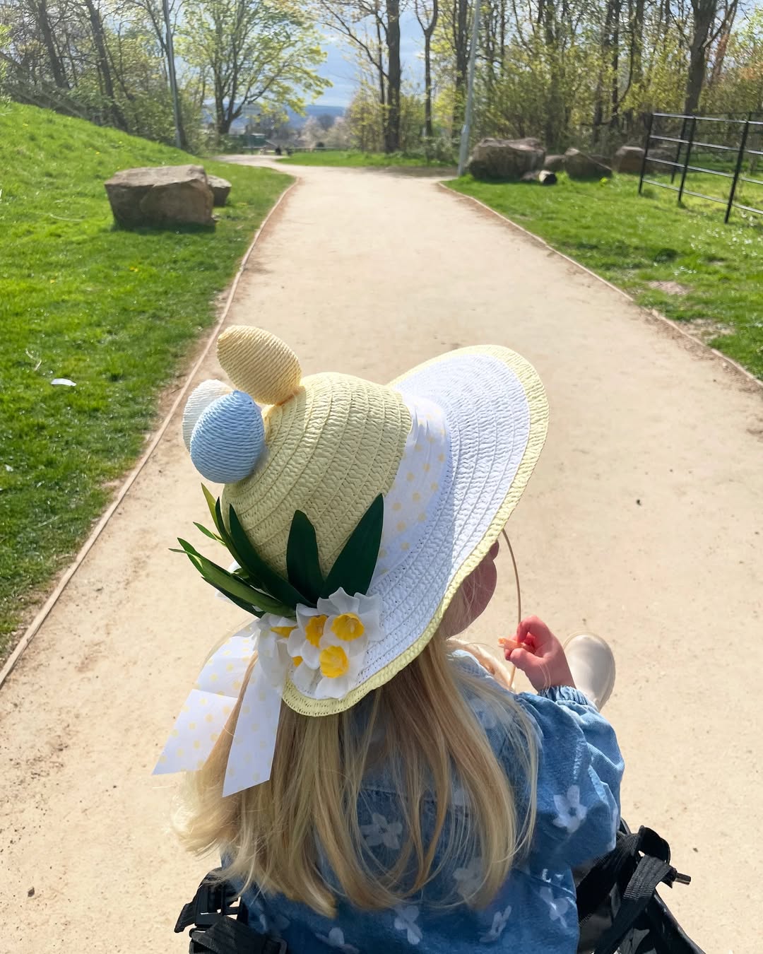 Soft straw gives this bonnet a natural base that lets the pastel decorations shine. Layers of blush, lavender, and cream flowers wrap around the crown like a tiny spring garden. Speckled eggs tucked between the blooms add a classic Easter detail. Delicate butterflies and tall bunny ears bring a dreamy, storybook finish that feels straight out of a fairytale.