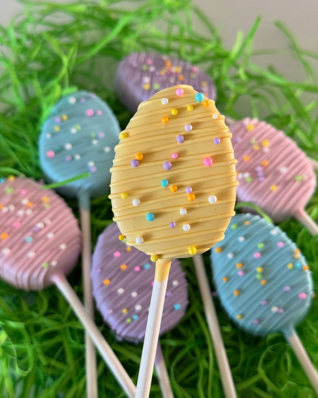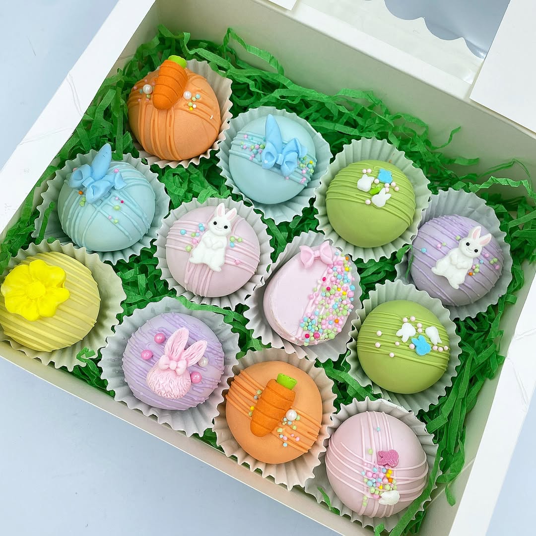 Pastel coating does most of the selling here. The egg shape reads instantly Easter, which makes these feel ready for gift boxes and dessert tables. A thin white drizzle adds that bakery-style finish without adding extra work. Tiny candy beads bring just enough sparkle to make a simple batch look custom-order ready.