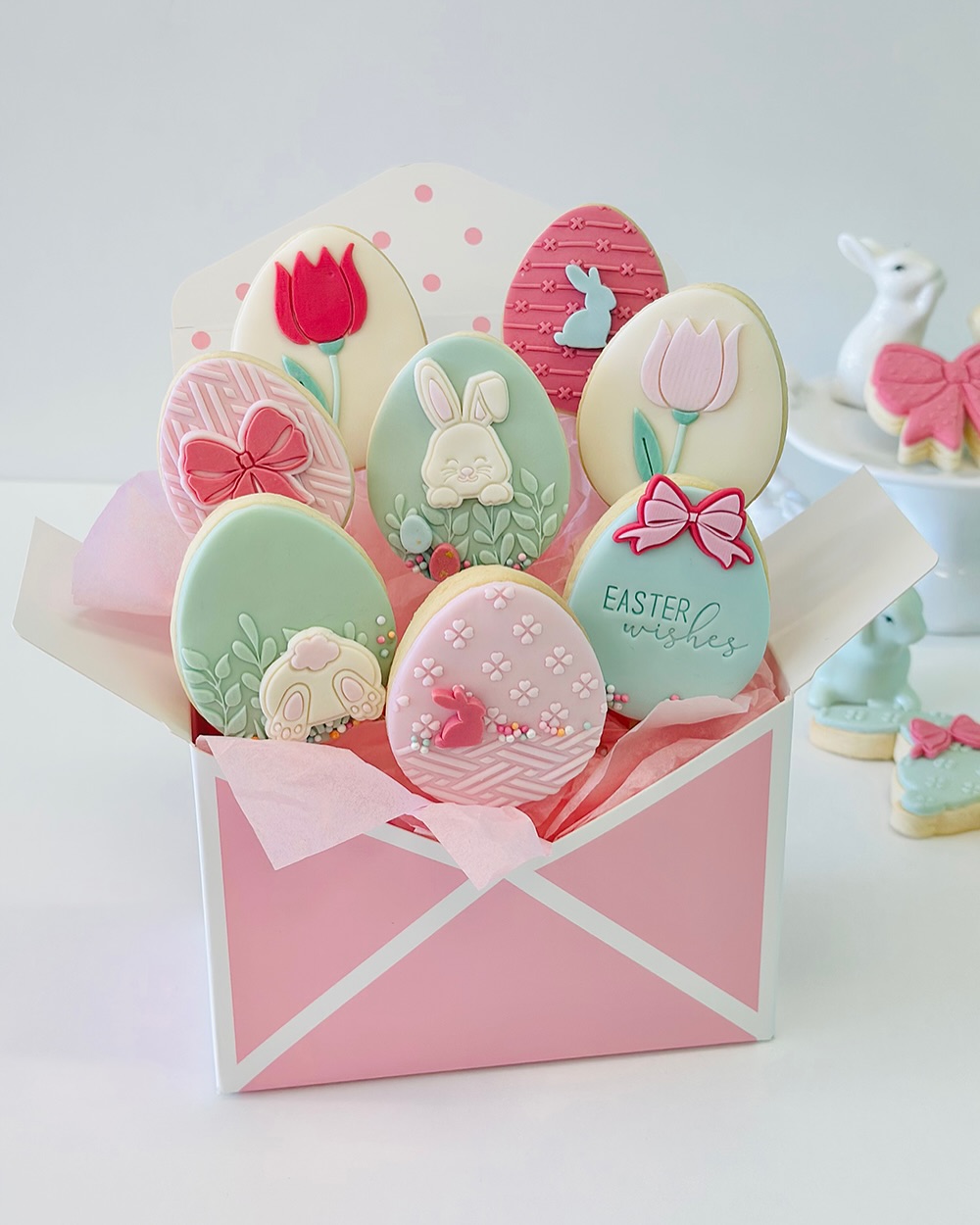 Soft pastel icing creates a gentle spring color palette across every cookie. Egg shapes become tiny canvases for bunnies, tulips, bows, and delicate patterns. Raised royal icing details add texture and give each cookie a handcrafted feel. Arranged in a gift-style box, the set looks ready for Easter baskets or holiday gifting.