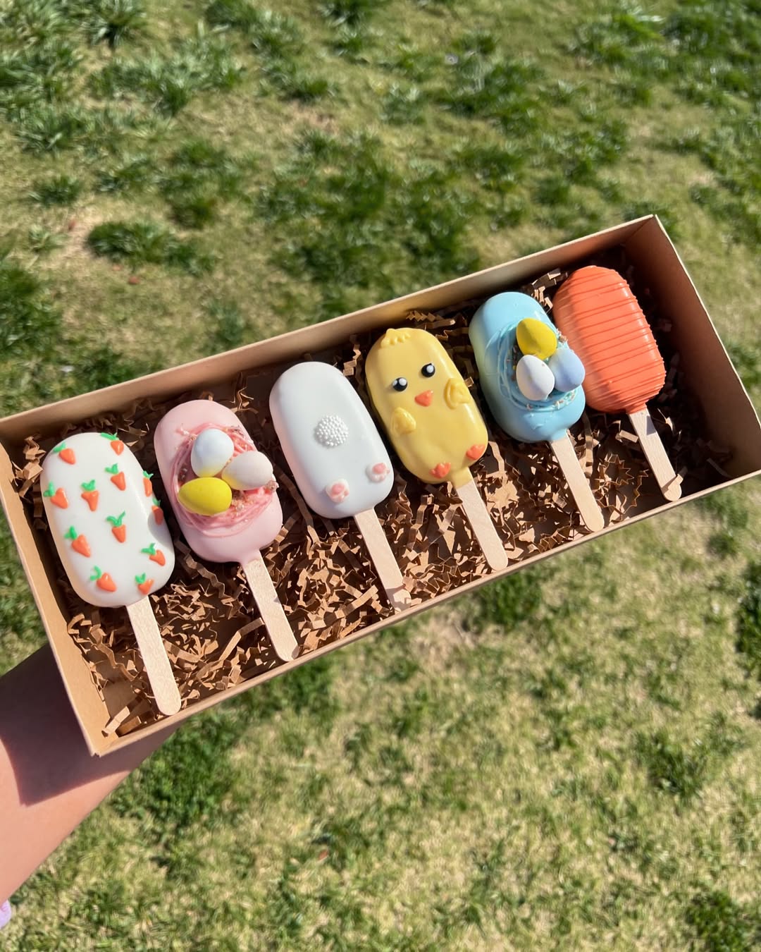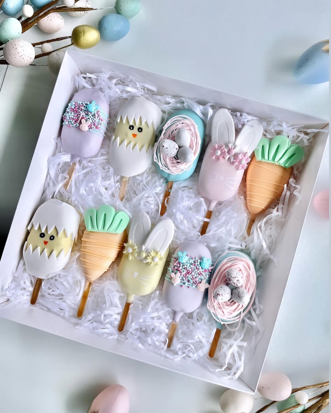 Soft pastel coatings create a gentle spring palette across the whole set. Each pop tells a different Easter story, from hatching chicks to bunny ears and tiny carrot shapes. Nest designs with mini speckled eggs add a sweet seasonal detail. Arranged in shredded filler, the box feels perfectly styled for gifting or Easter brunch tables.