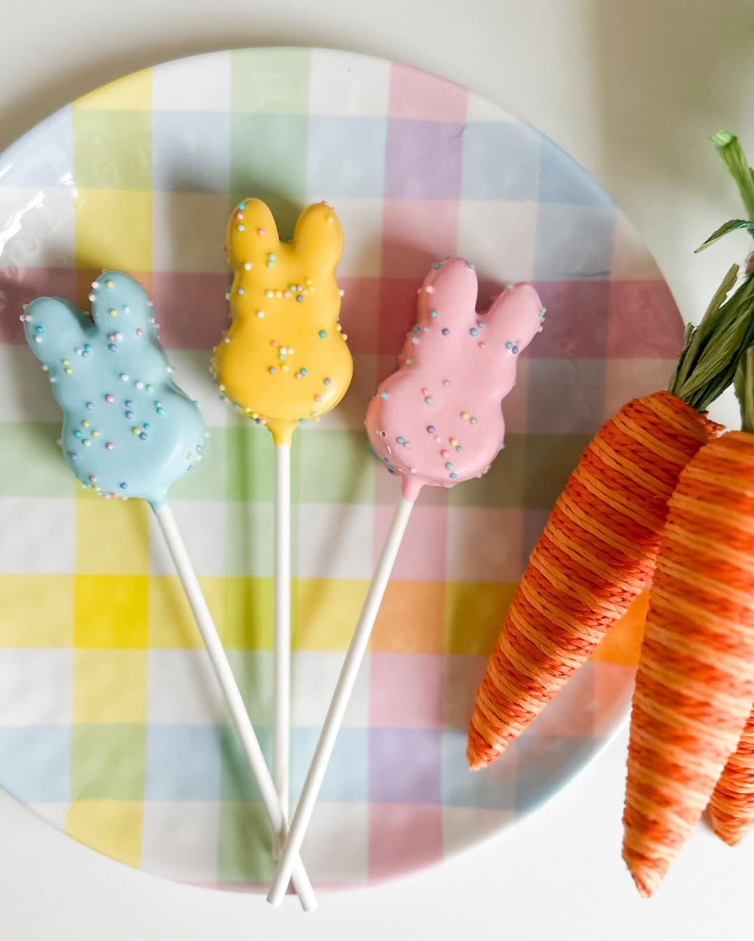 Soft pastel chocolate turns simple bunny shapes into cheerful spring treats. Light blue, yellow, and pink coatings create a classic Easter palette. Tiny candy sprinkles add just enough texture and sparkle. Set against a gingham plate, the pops feel perfectly styled for an Easter brunch table.