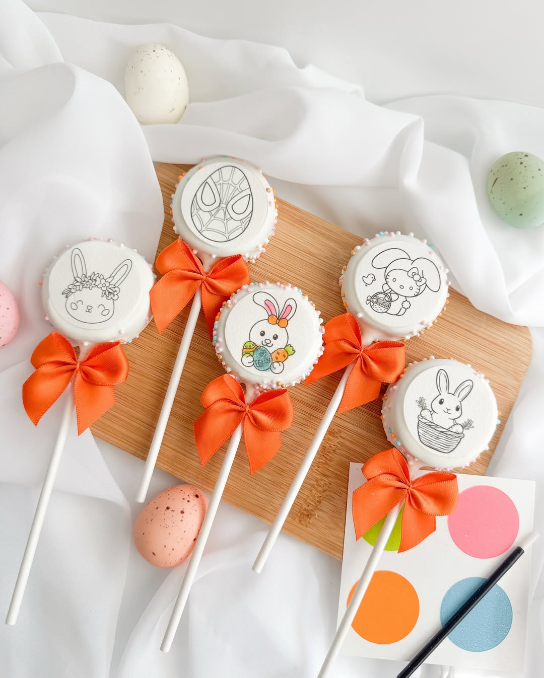 Clean white coating keeps the focus on the printed Easter characters. Bunny and chick illustrations give each pop a playful storybook feel. Bright orange ribbon bows add a bold pop of color and make them look gift-ready. A border of tiny sprinkles finishes the design with a delicate bakery touch.