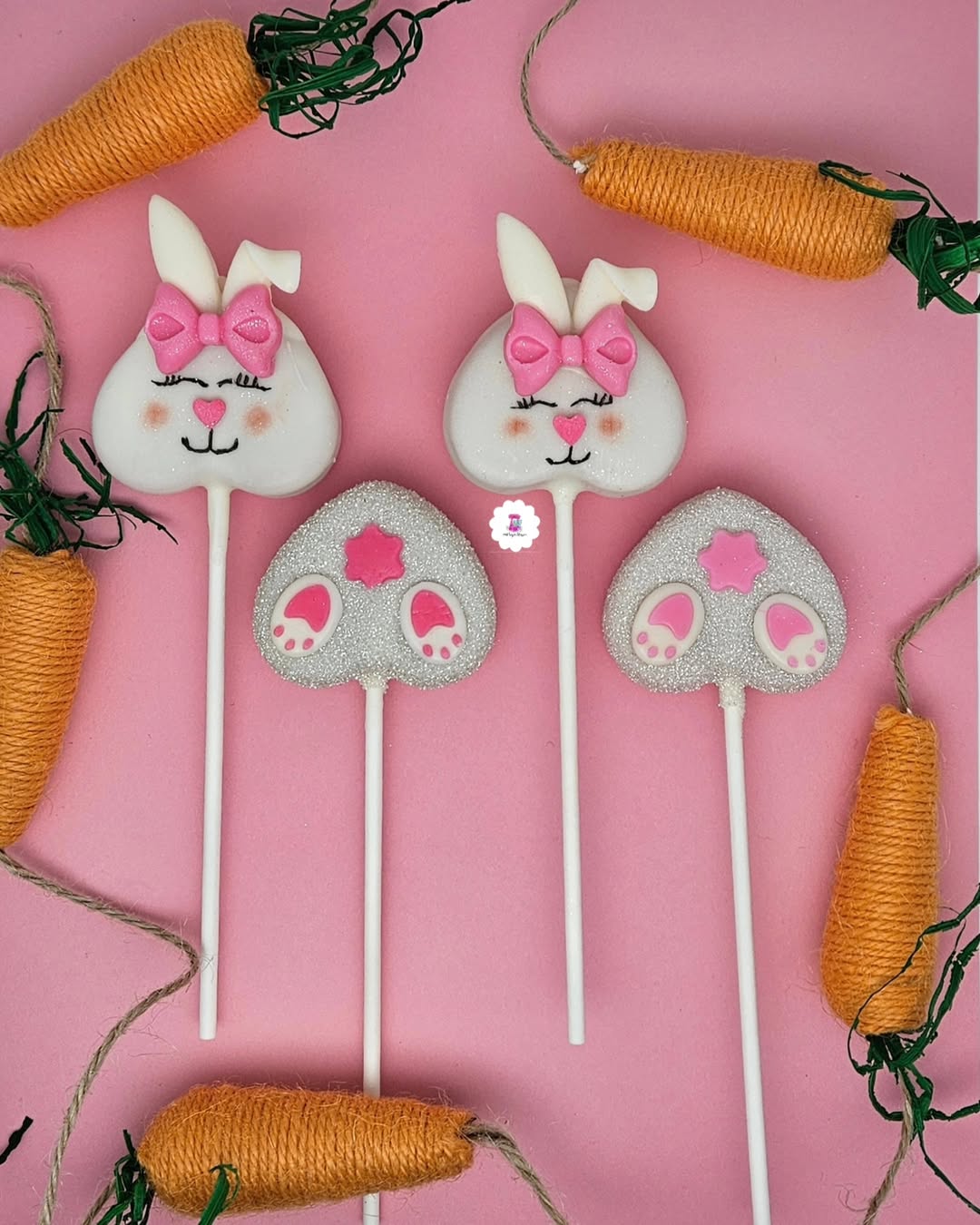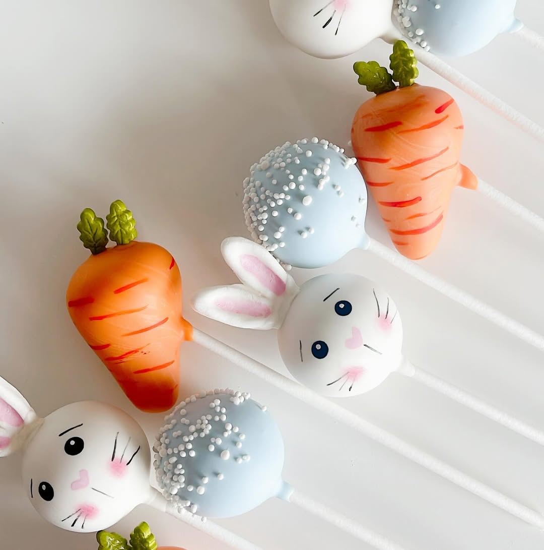 Soft white coating gives these bunny pops a clean, polished look. Pink bows, rosy cheeks, and closed lashes add a playful personality. Glittery bunny tail designs bring texture and a little sparkle. Set against a pink backdrop with carrot accents, the whole setup feels made for Easter treats and party favors.