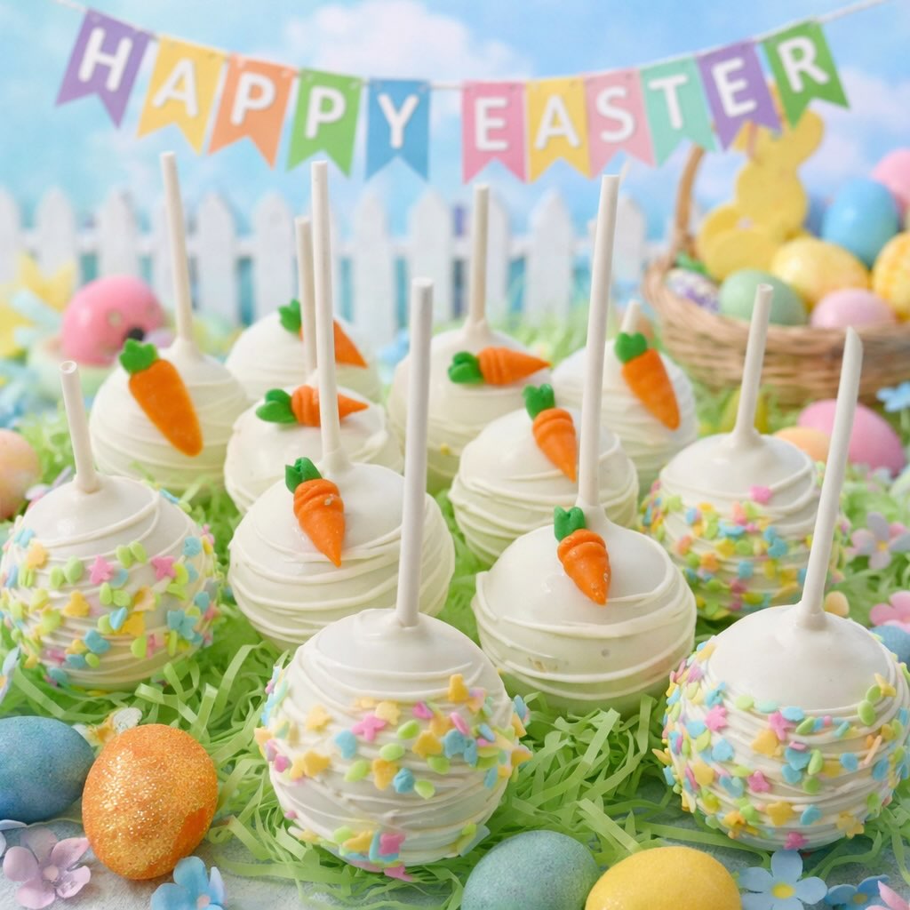 Bright white coating keeps the look clean and classic. Tiny fondant carrots instantly turn each cake pop into an Easter-themed treat. A mix of drizzle lines and pastel sprinkles adds just enough texture and color. Set against grass-like filler and holiday decor, these pops feel made for party tables and spring bakery boxes.