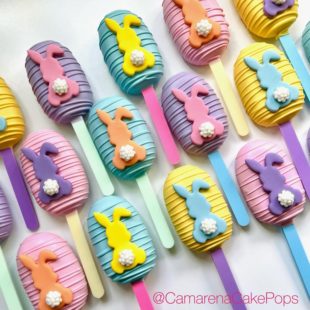 Soft pastel chocolate instantly sets a playful spring palette. Flat bunny toppers create a clear Easter theme without complicated shaping. Thin drizzle lines add texture and give each pop a bakery-style finish. Colorful sticks underneath quietly double the fun and make the whole batch feel party-ready.