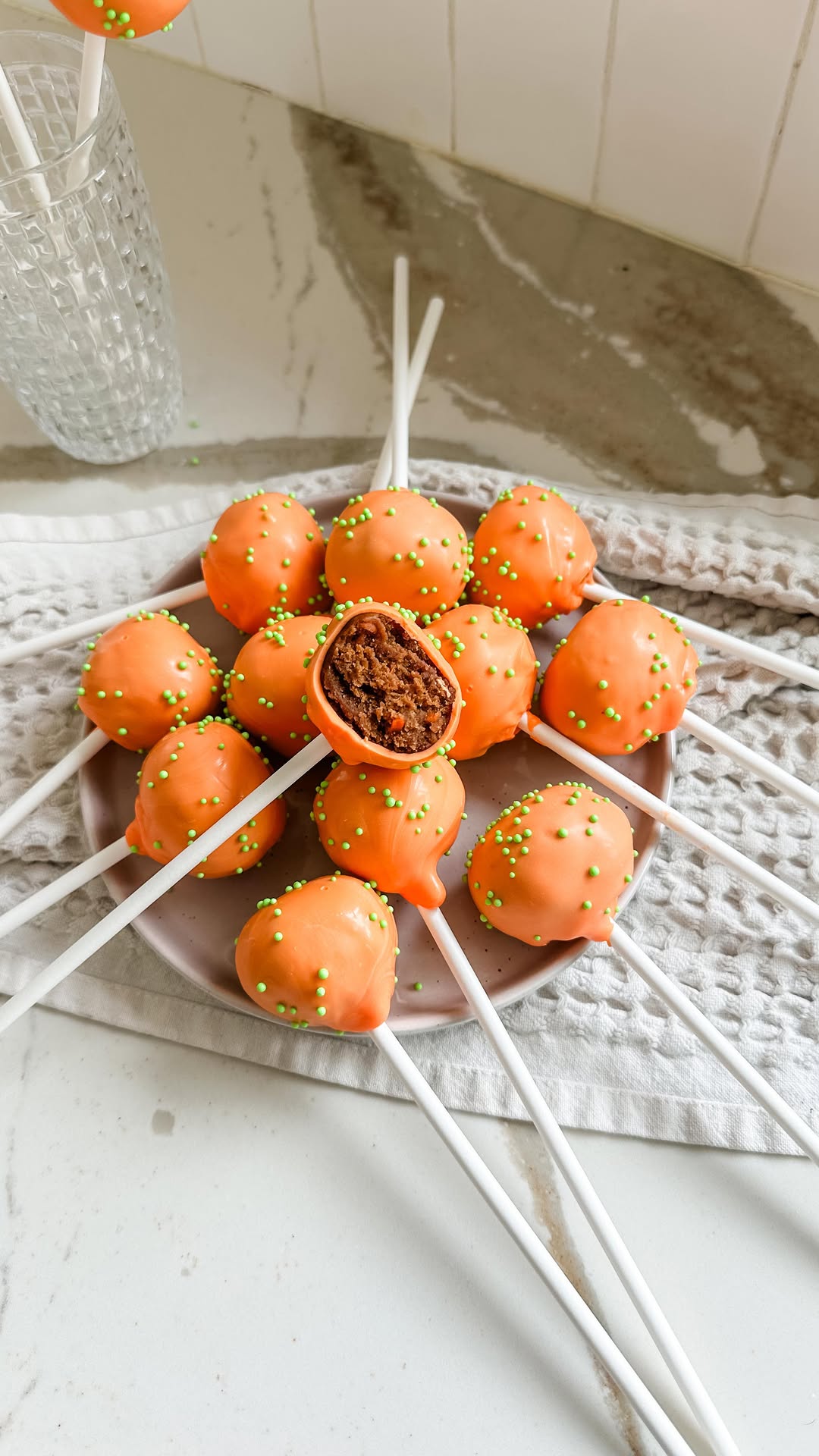 Bright carrot-orange coating instantly hints at the flavor inside. A sprinkle of tiny green sugar pearls adds a playful nod to carrot tops. One pop cut open reveals the moist carrot cake center, which makes these feel extra homemade. Simple, colorful, and perfect for a last-minute Easter dessert tray.