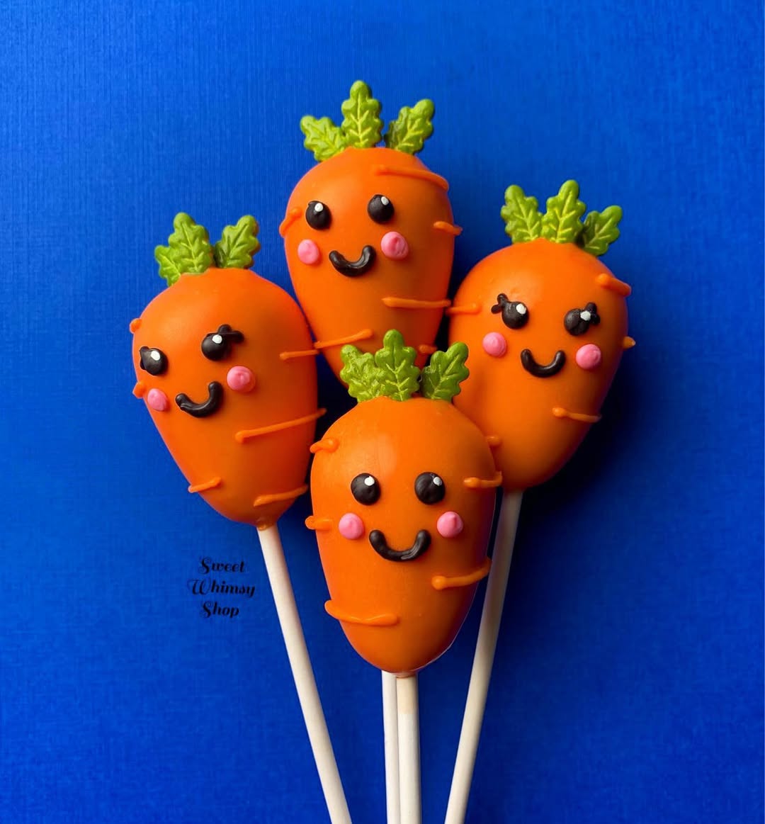 Bright orange coating instantly brings the carrot theme to life. Tiny piped eyes, rosy cheeks, and curved smiles give each pop a playful personality. Green leaf toppers finish the look and make the shape instantly recognizable. It’s the kind of cheerful design that kids and Easter dessert tables can’t ignore.
