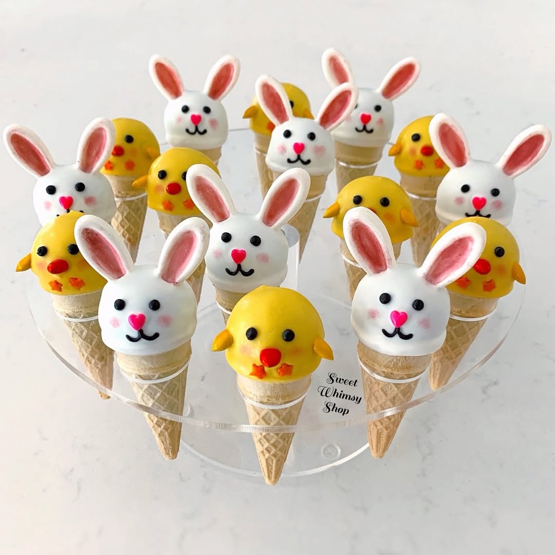 White bunny pops bring classic Easter charm with tall pink ears and tiny heart noses. Bright yellow chick pops add contrast and playful character. Serving them on mini waffle cones turns each pop into a tiny dessert treat. It’s a clever display idea that makes a simple batch feel party-ready.