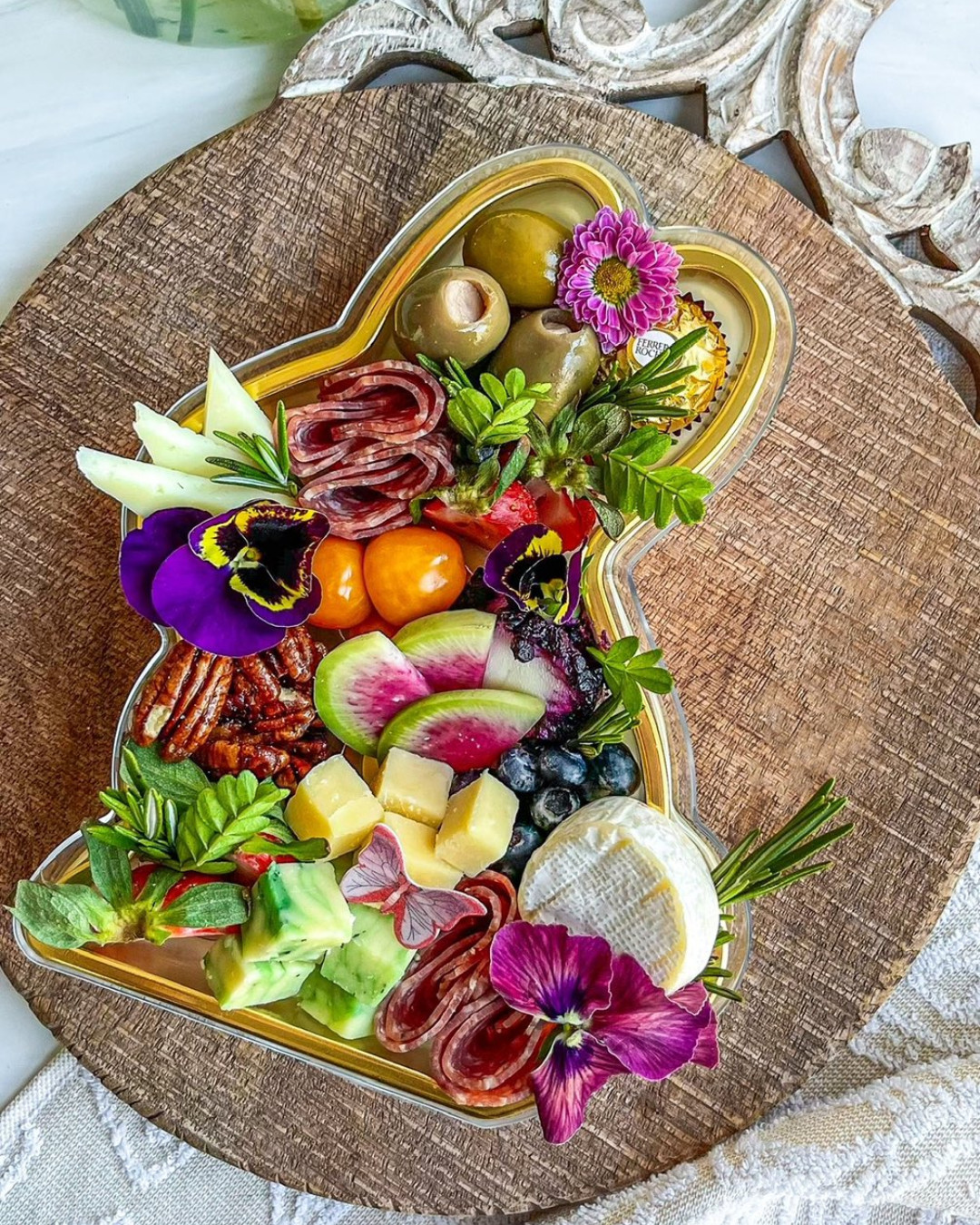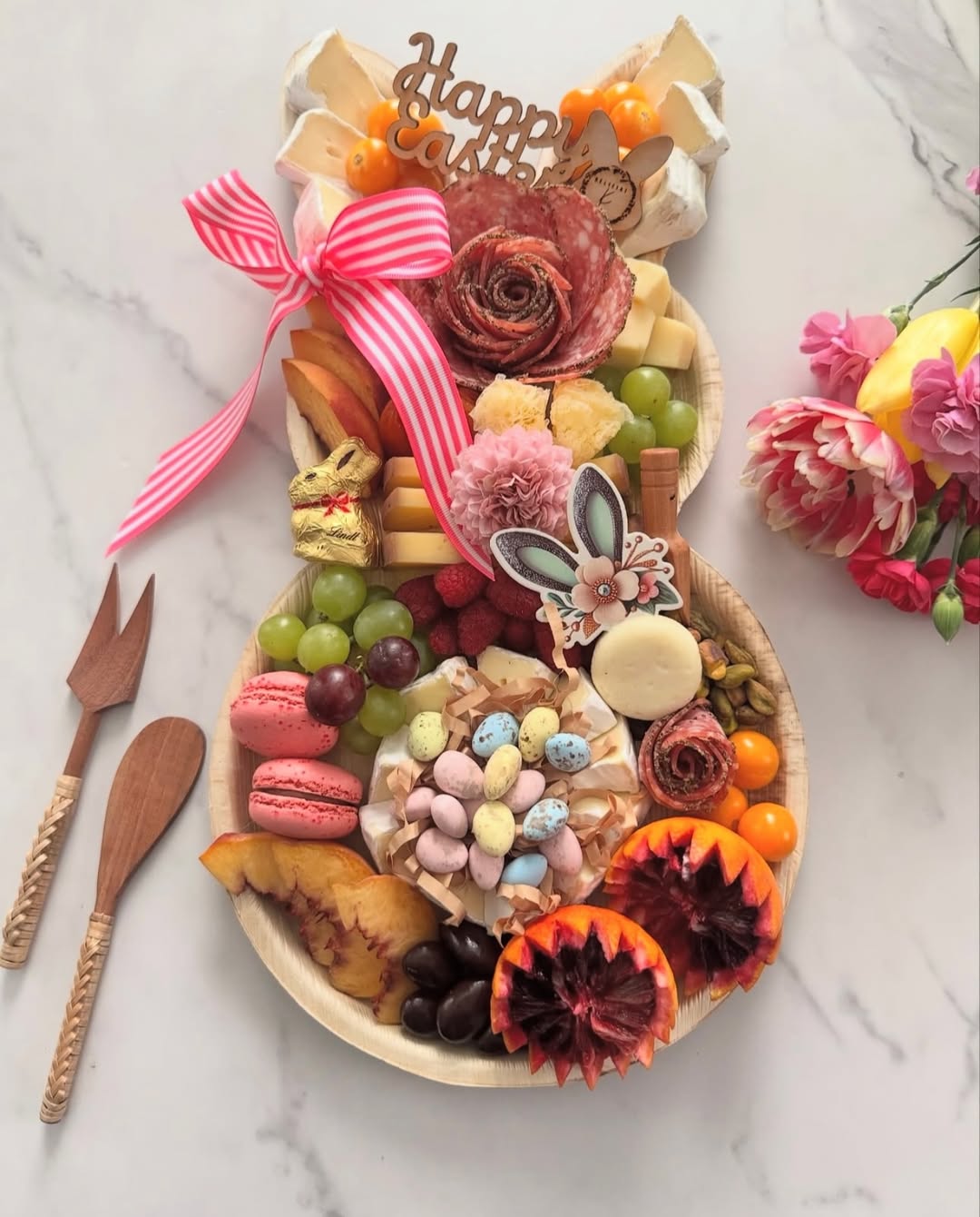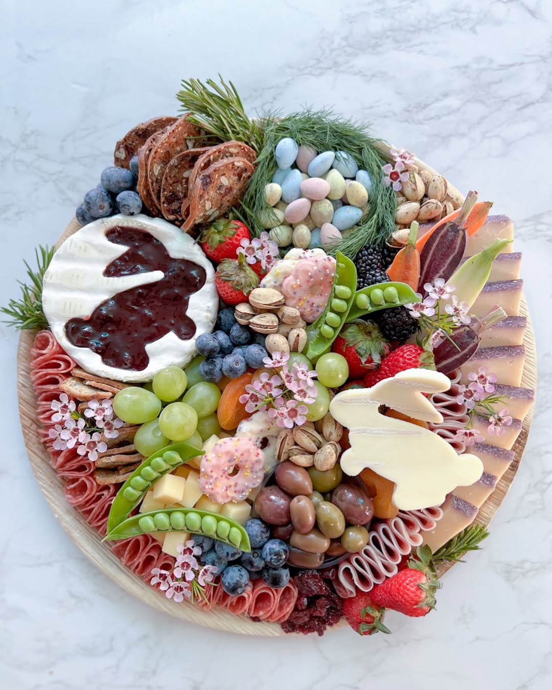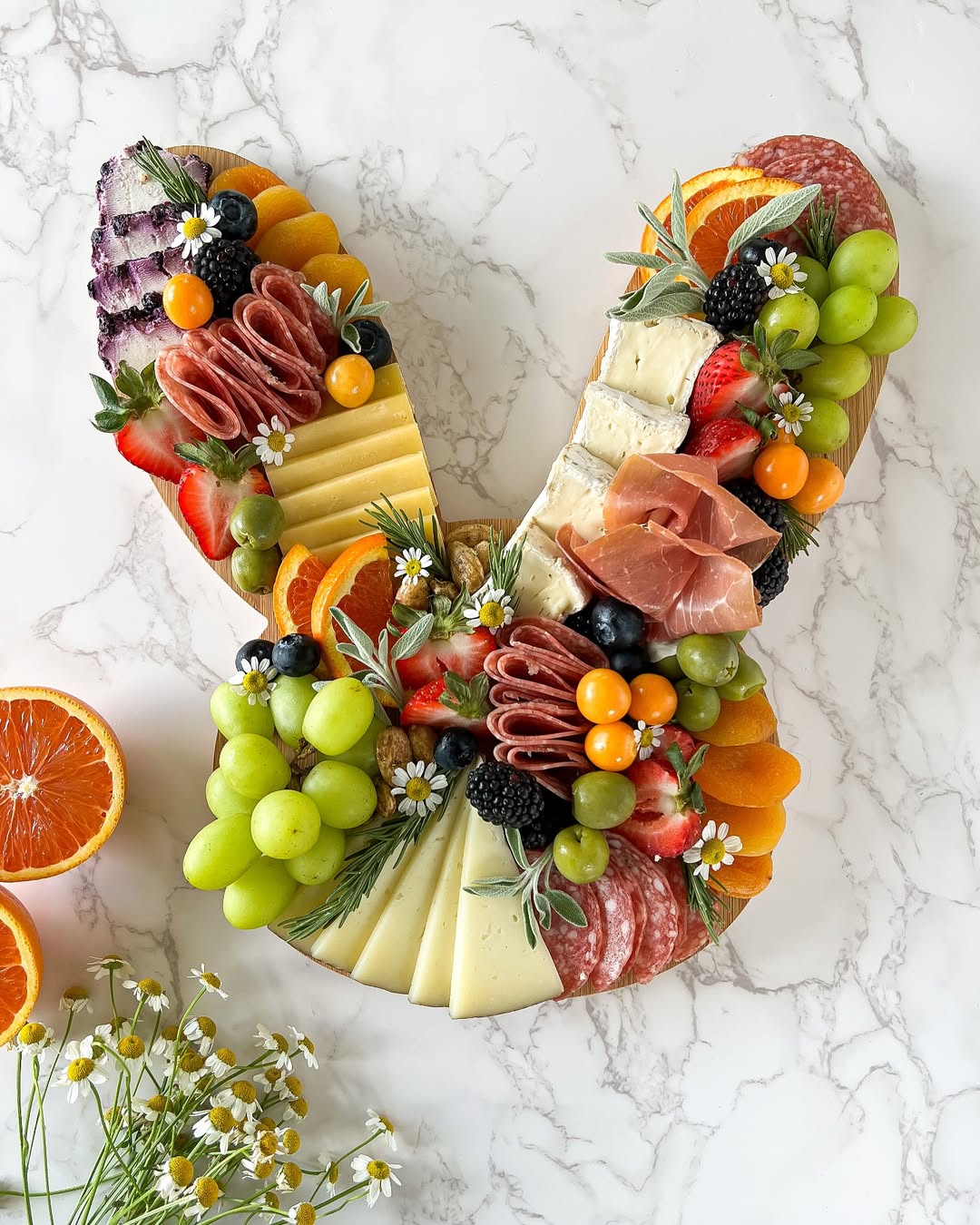 Negative space does part of the work here. The clean bunny outline feels crisp against the marble, making the arrangement pop even more. Ingredients are layered in sections, so every bite looks intentional and easy to grab. Smart move: using fresh fruit, herbs, and florals keeps it light, seasonal, and highly sellable.