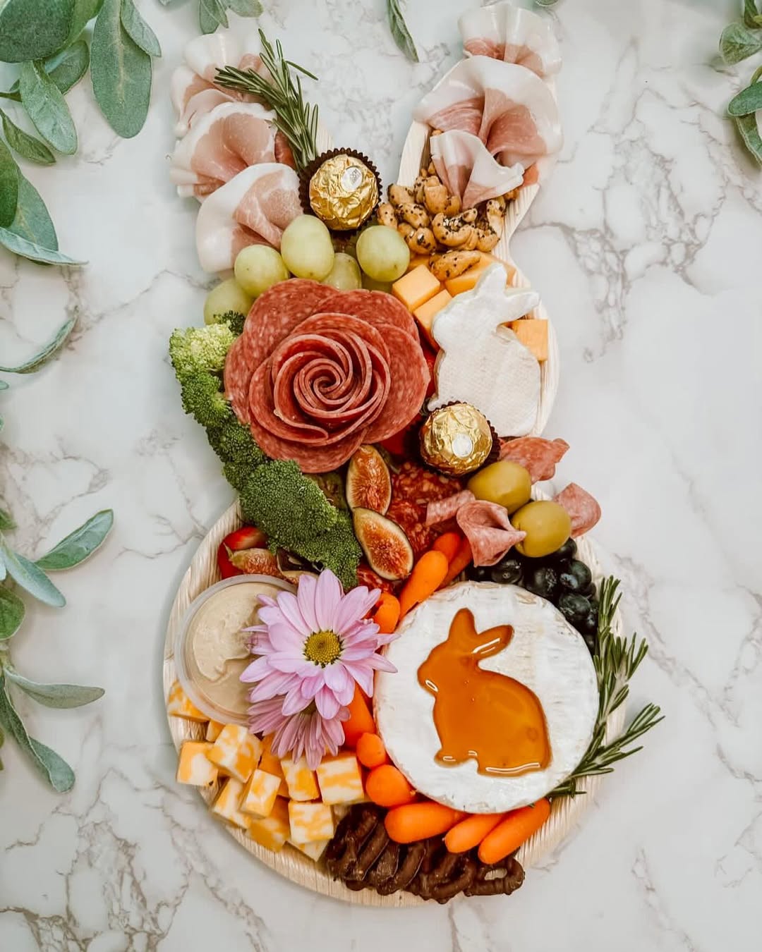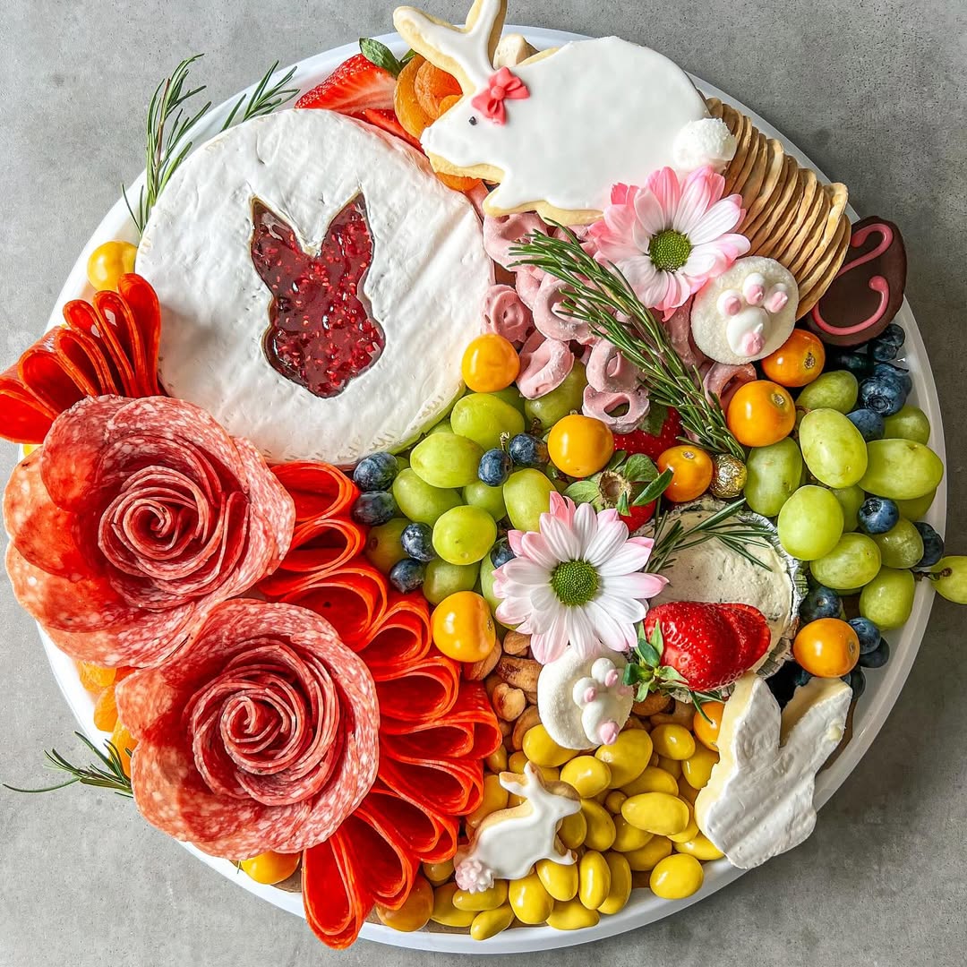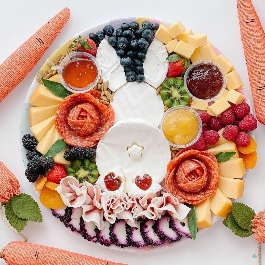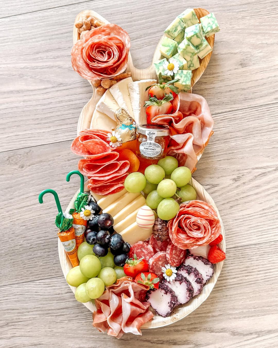 A mini honey jar placed right in the middle adds a premium, giftable touch. Salami roses scattered across the board create visual rhythm and keep the layout feeling styled. Soft cheeses and fresh grapes balance richness with light, easy bites. Smart move: using the bunny-shaped board keeps everything festive without overcomplicating the design.