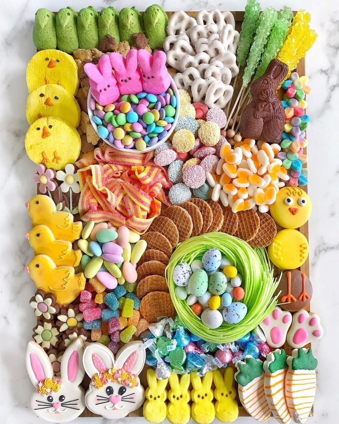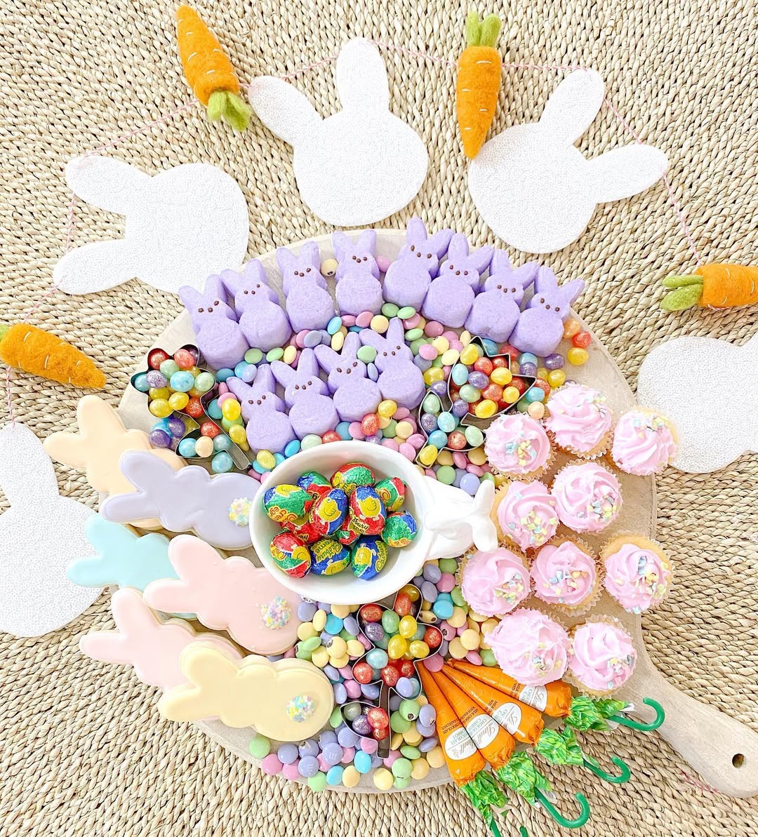 Pastel candy completely takes over the board. Rows of marshmallow bunnies and frosted cookies create a playful, almost cartoon-like Easter scene. Mini cupcakes and chocolate eggs add layers of texture without breaking the color story. Smart move: keeping everything in soft hues makes it feel cohesive, themed, and easy to market.