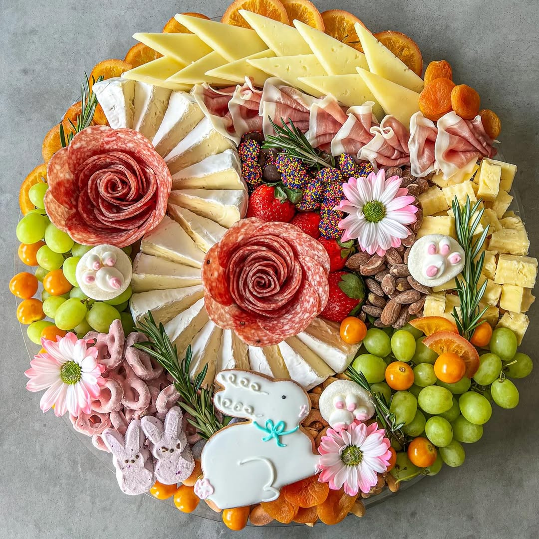Color does a lot of the selling here. Pastel bunny sweets, pink flowers, and citrus slices pull the board straight into Easter territory without feeling gimmicky. The salami roses and neatly fanned brie make it look premium, which is exactly what you want for something giftable or order-worthy. Smart move: mixing playful details with crowd-pleasers like grapes, cheese, and prosciutto keeps it cute enough for photos and practical enough to eat.