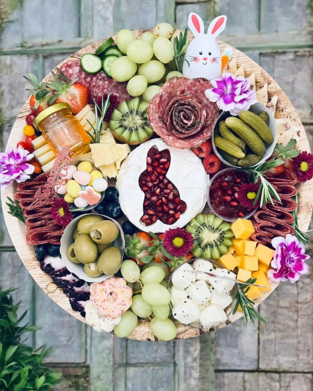 A bunny-shaped brie filled with glossy pomegranate seeds becomes the star instantly. Jewel tones from fruit, pickles, and flowers give the board a rich, almost festive depth. Small bowls break up the layout and keep everything feeling organized and easy to serve. Smart move: combining bright garnishes with structured sections makes it look abundant but still polished enough to sell.