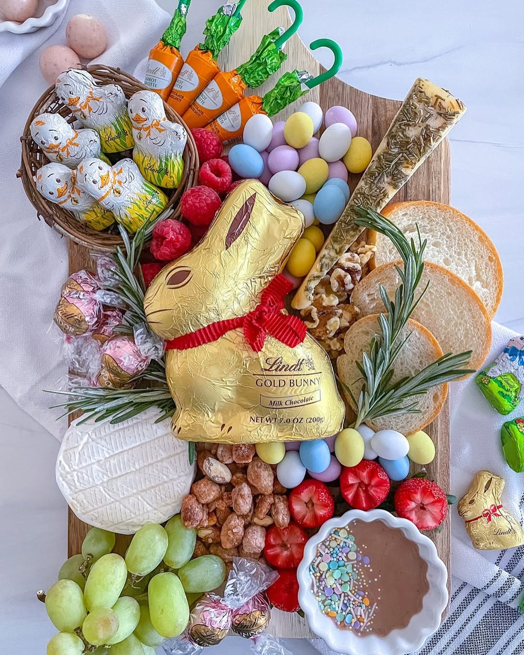 It’s all about that oversized gold bunny moment. The board leans playful and nostalgic with candy eggs, foil-wrapped chicks, and carrot chocolates doing the visual storytelling. Soft cheeses and sliced baguette balance the sugar rush just enough to keep it functional. Smart move: adding a chocolate dip with sprinkles turns this into an interactive, crowd-pleasing sell.
