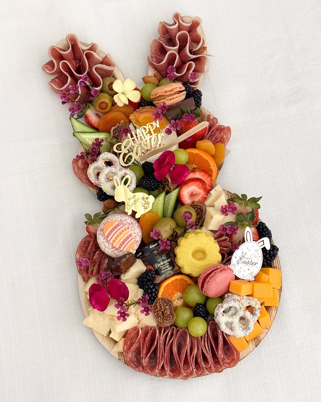 Shape does the heavy lifting here. The bunny silhouette instantly makes the board feel custom and occasion-ready without needing extra explanation. A bold ribbon and “Happy Easter” topper add that giftable, boutique finish customers love. Clever touch: the mix of macarons, chocolate eggs, and cured meats keeps it playful but still worth the price tag.
