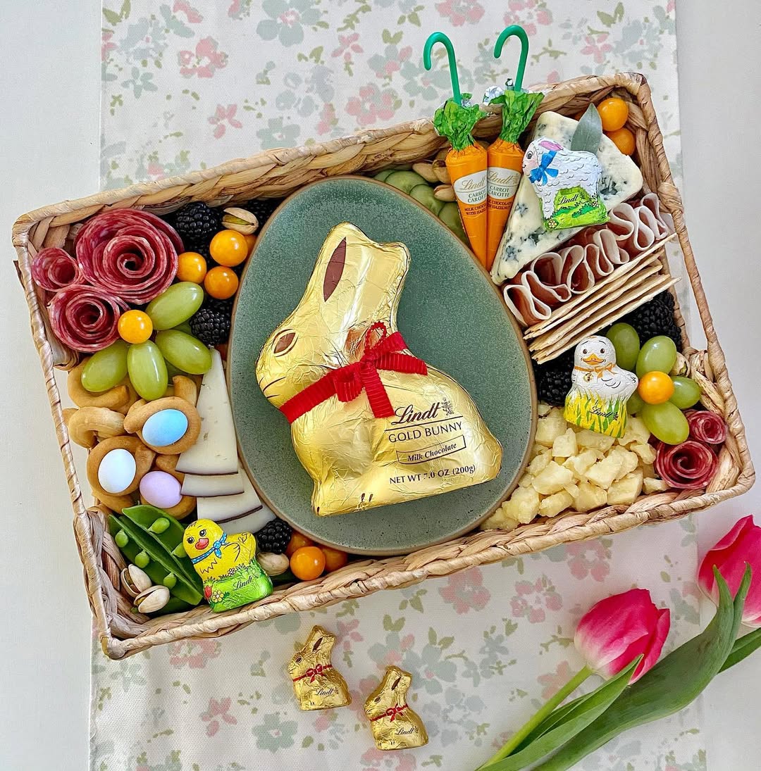 The woven tray instantly gives this a gift-basket feel. A single gold bunny placed on a plate creates a clean focal point that draws the eye first. Surrounding snacks are neatly sectioned, which keeps it looking organized instead of crowded. Smart move: balancing candy, cheese, and crackers makes it feel both festive and functional for sharing.
