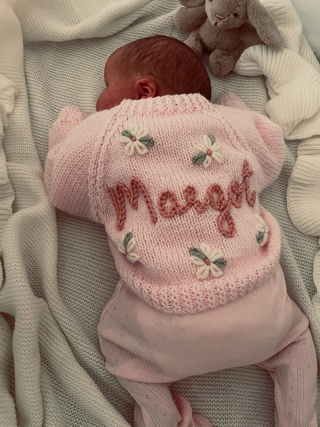 Blush knit turns this cardigan into a soft statement piece. The raised script embroidery adds bold texture that pops beautifully in newborn photos. Scattered floral stitches keep the look delicate and handcrafted. This is the personalized layer parents reach for during those first cozy weeks at home.