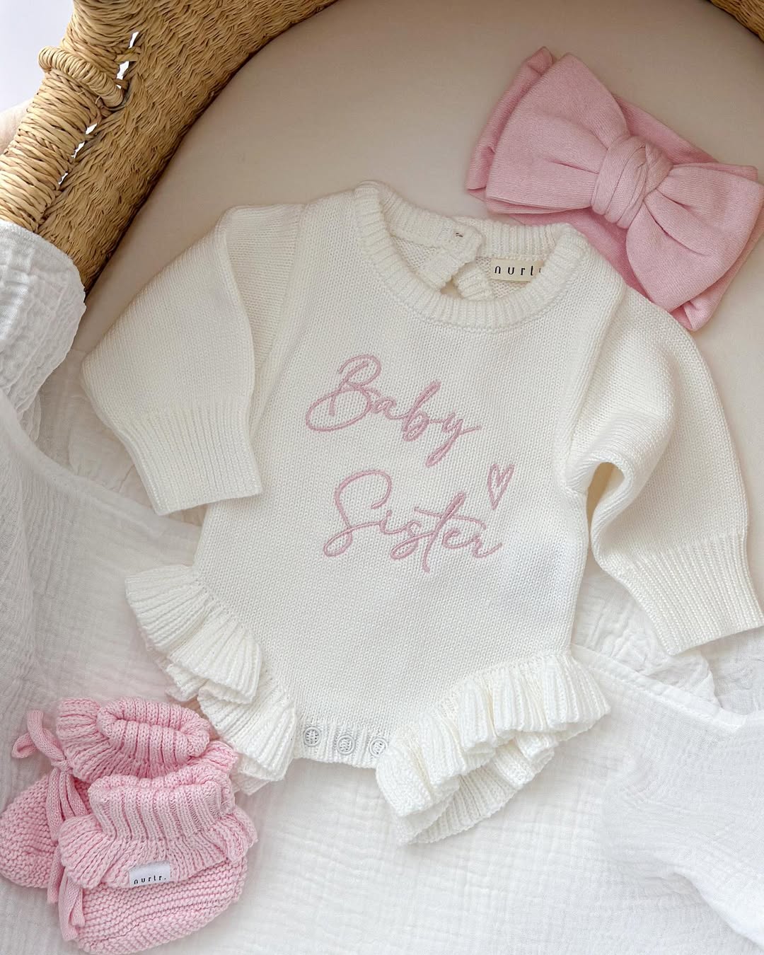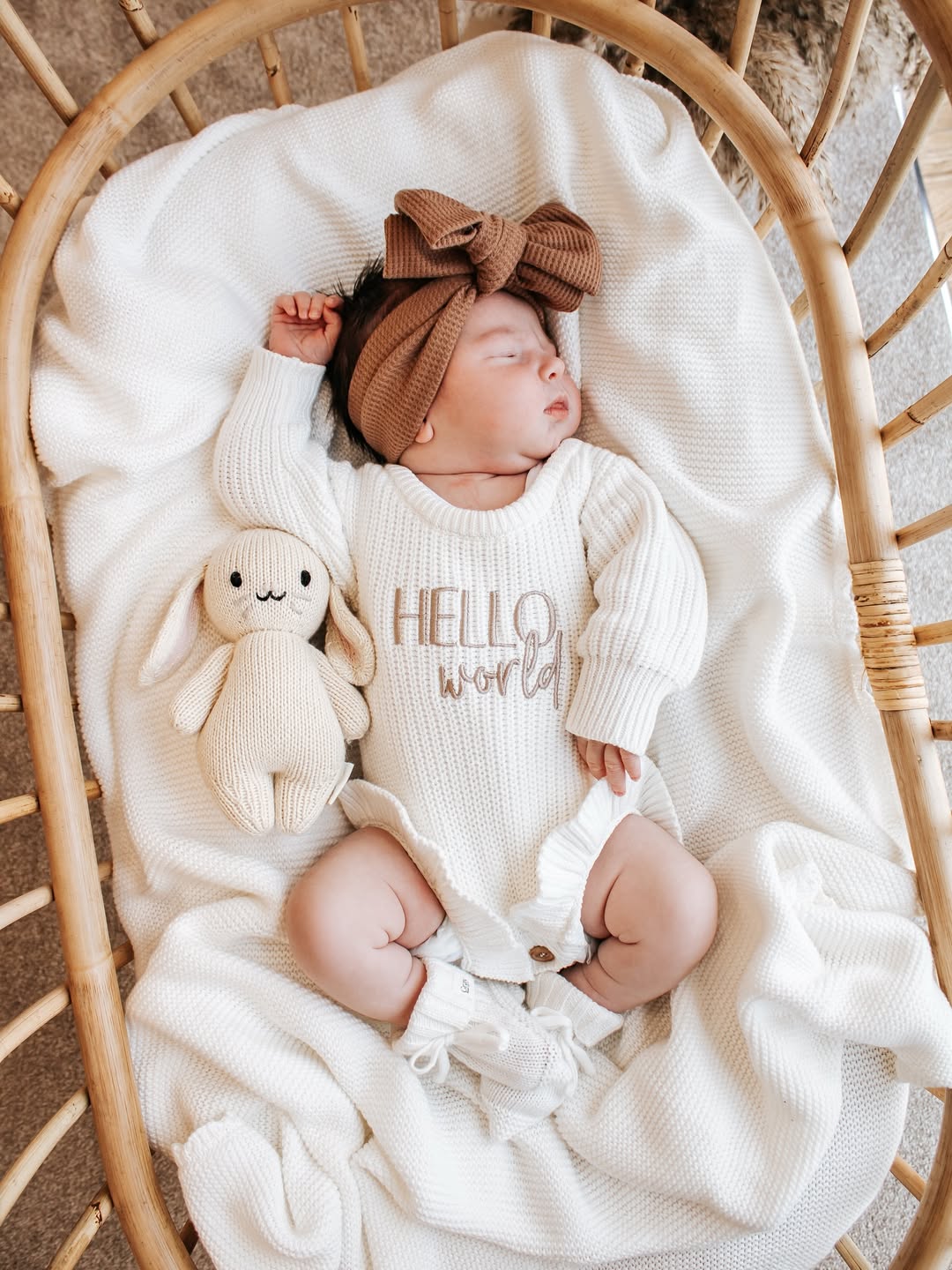 Warm oatmeal knit sets the tone from the start. The soft taupe lettering feels subtle but meaningful against the creamy ribbed fabric. A chunky bow headband adds just the right dose of drama. Styled in a woven bassinet with a knit bunny sidekick, this is newborn announcement gold.