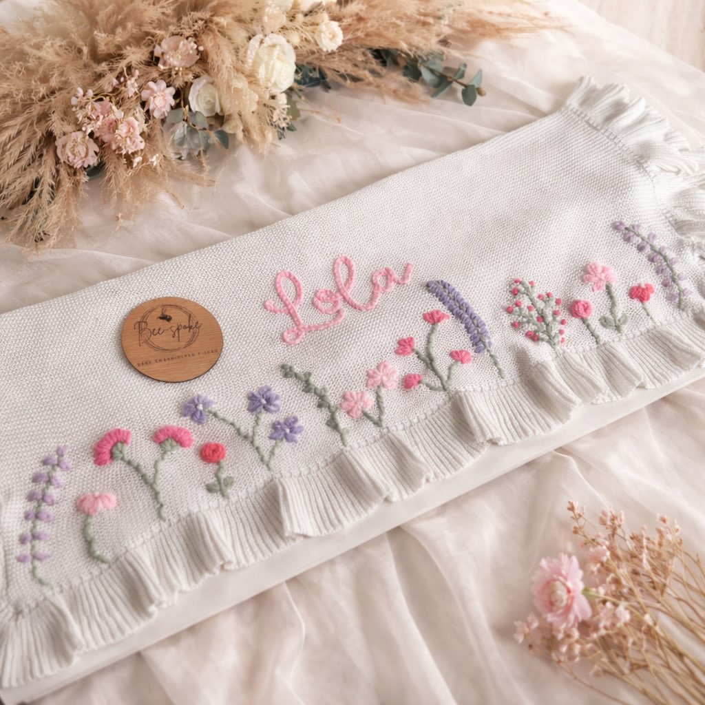 Soft ivory knit keeps the palette airy and nursery-friendly. The name floats above a stitched wildflower border in blush, lavender, and sage. Each bloom is individually embroidered, giving the piece that slow-made charm shoppers pay for. Add a ruffled edge, and suddenly it feels like wall art disguised as a blanket.