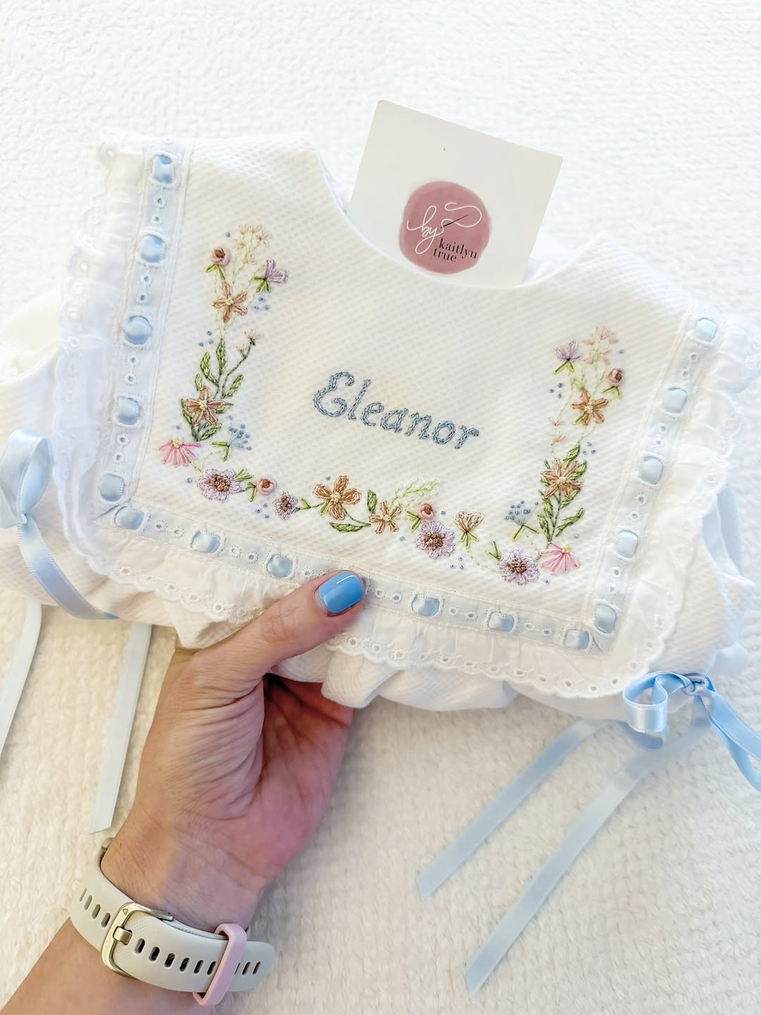 Soft waffle cotton gives this bib a gentle, heirloom feel. The name sits at the center of a hand-embroidered floral wreath in muted pastels. Powder blue ribbon threading and lace trim frame the design like a tiny keepsake collar. This is the kind of personalized piece parents save long after the drool stage ends.