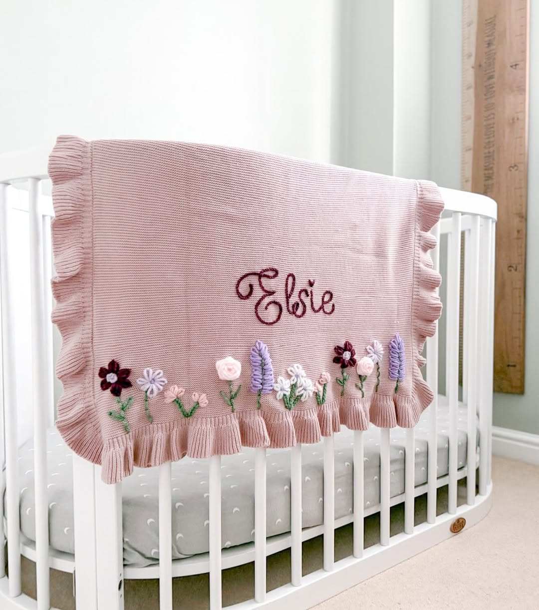 Dusty blush knit sets a soft, romantic tone against the crisp white crib. The embroidered name sits proudly at center, stitched in a rich berry thread for contrast. A row of dimensional florals dances along the hem, adding texture and charm. This is nursery styling and personalization rolled into one sellable showpiece.